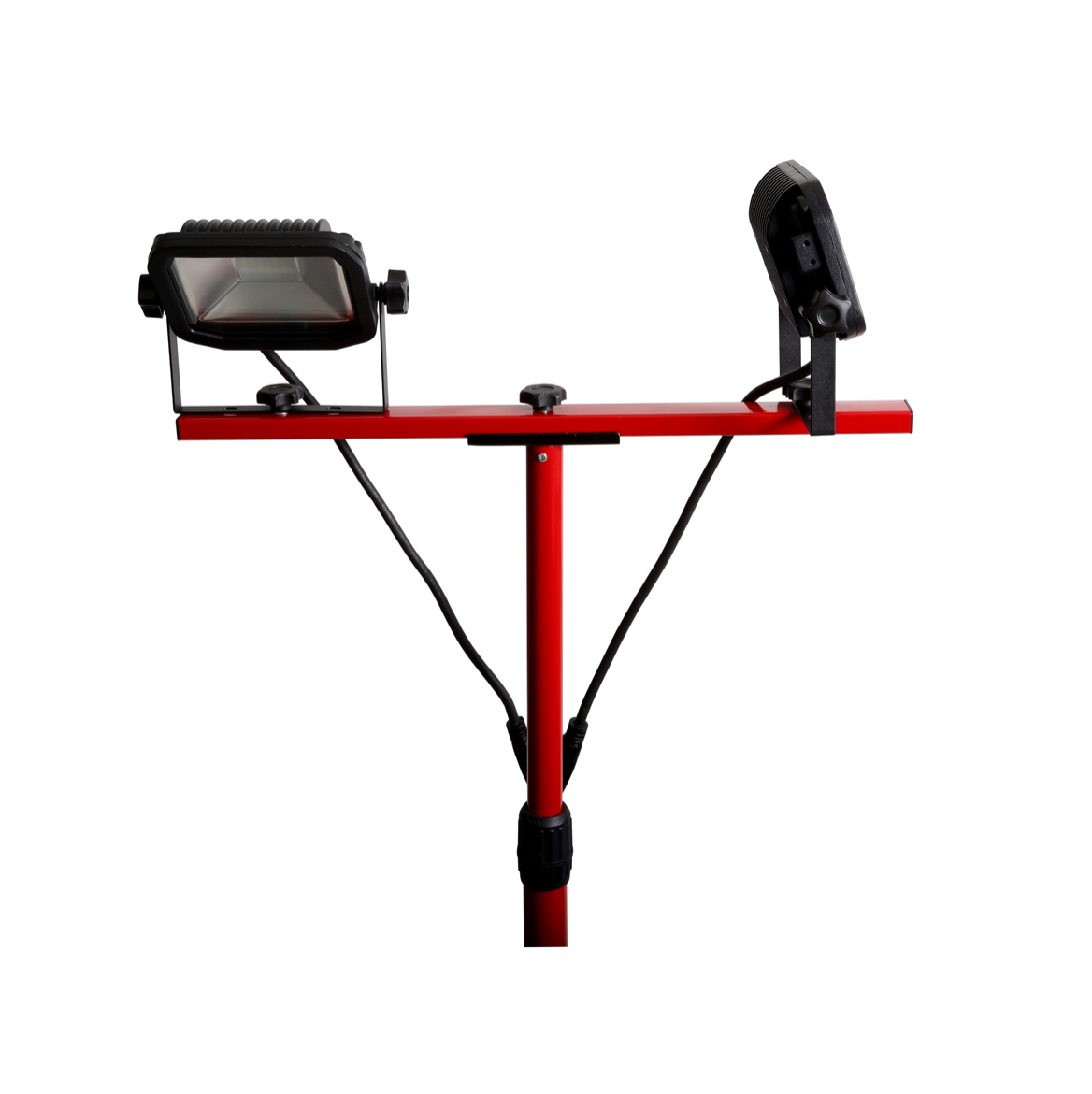 Der Luceco Doppelstrahler lässt sich, dank des höhenverstellbaren Stativs, einfach bis auf 1,5m ausfahren. Für einen sicheren Stand des Strahlers sorgen drei aus robusten Stahl gefertigte Füße. Die beiden schwenkbaren Flutlichter können unabhängig voneinander ein- und ausgeschaltet werden. Der Winkel des Lichtstrahls ist mit Hilfe von Schrauben bis zu 95° verstellbar. Das weiße, neutrale Licht fühlt sich, beim Arbeiten im Inn- und Außenbereich, angenehm an. Dazu ist der Strahler nach IP 65 vor Staub und Spritzwasser geschützt. Aufgrund moderner LED Technologie spart man 90% der Energie im Vergleich zu einer Halogenlampe. Die Lebensdauer beträgt laut Herstellerangaben 30.000 Stunden.