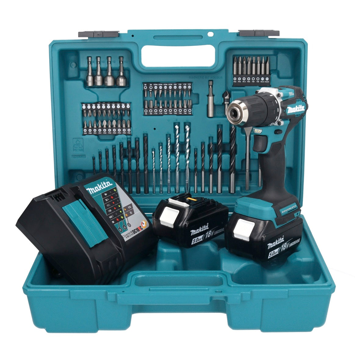 Makita DDF 487 RTX1 Akku Bohrschrauber 18 V 40 Nm Brushless + 2x Akku 5,0 Ah + Ladegerät + 74 tlg. Zubehörset + Koffer