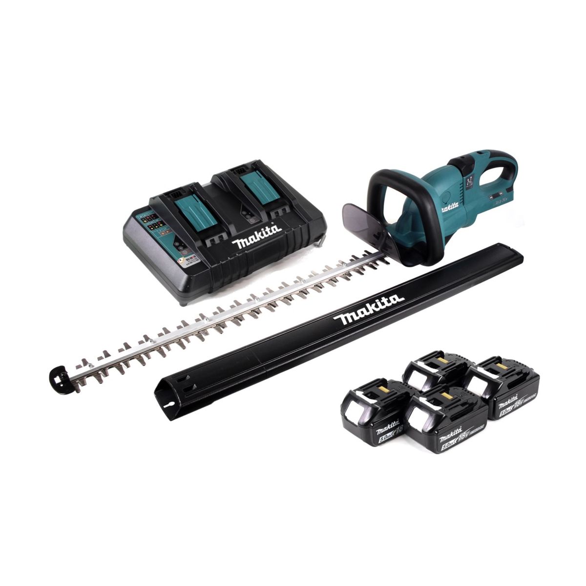Die Akku-Heckenschere DUH 651 aus dem Hause Makita überzeugt mit ihrem leistungsstarken 36V - Motor (2x18V) und einem ergonomischen und drehbaren Griff. Dieser ermöglicht eine Arretierung bei 0°, 45° und 90°, wodurch stets eine optimale Haltung beim Arbeiten möglich wird. Die Heckenschere arbeitet sehr leise, wodurch in besonders lärmempfindlichen Bereichen gearbeitet werden kann. Die optimal ausgewogene Gewichtsverteilung reduziert Ermüdungserscheinungen in Unterarm und Händen. Des Weiteren ist die DUH 651 mit einem Sanftanlauf, einer Motorbremse und einem rostfreien Messer ausgestattet. Die Hubzahl lässt sich elektronisch regeln. Inklusive zu der Makita DUH 651 Heckenschere kommen vier Makita BL 1850 B 18 V -  5 Ah / 5000 mAh Li-Ion Akku mit LED - Anzeige und ein Makita DC 18 RD Ladegerät 7.2V - 18V für 2 Li-Ion Akkus - 2-fach Ladegerät hinzu. Der Makita BL 1850 B Akku überzeugt durch seine lange Arbeitszeit. Ein zusätzlicher Vorteil ist die kurze Ladezeit von nur 45 Minuten im Makita Ladegerät. Der Akku verfügt dank geringer Selbstentladung und Kurzschluß-, Überspannungs- und Überhitzungsschutz über maximale Lebensdauer. Zudem besitzt der BL 1850 B noch eine LED - Ladestandsanzeige zum Überprüfen der Restenergie im Akku. Das DC 18 RD ist ein 2-fach Ladegerät von Makita womit 2 Akku´s gleichzeitig geladen werden können. Das Schnellladegerät kann wie gewohnt alle Akku´s von 7,2 V bis 18 V laden. Der praktische USB Anschluss an der Vorderseite eignet sich perfekt für Smartphones, Lampen und vieles mehr was mit USB Ladefähig ist.