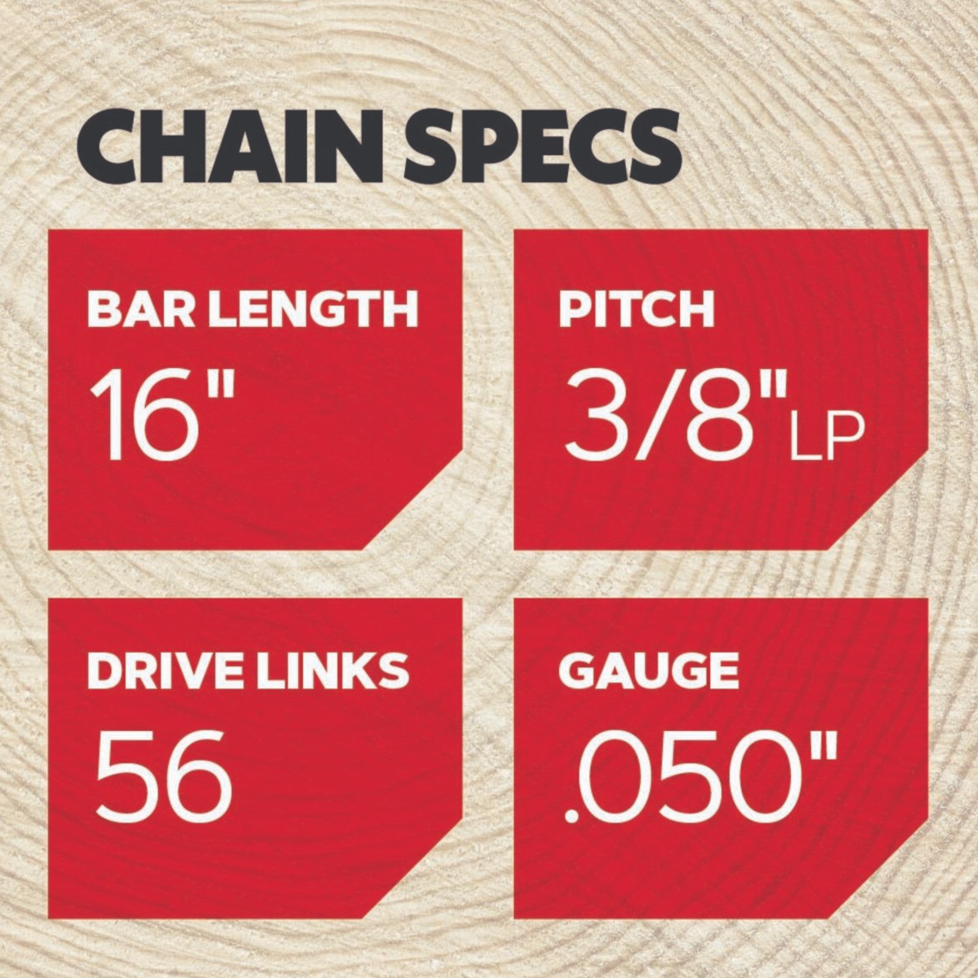 The Oregon 91VXL 3/8" Low Profile™ High Performance Chain is the ideal choice for arborists and orchardists who need a powerful but lightweight chainsaw. Designed for professional applications, this chain offers extended cutting life thanks to its long top cutting edges, allowing you to work more efficiently and precisely. With a pitch of 3/8" Low Profile™ and a thickness of 1.3 mm (.050"), the 91VXL chain offers excellent cutting performance with less kickback, making it a safe choice for professional use. The chain has 56 links of chain drive and is suitable for saws up to 42 cm³. Thanks to LubriTec™ technology, the chain and guide bar are continuously lubricated, which minimises friction and extends the service life of the tool. The chain also offers excellent corrosion resistance thanks to blued cutters, which provide high-quality protection against wear and the effects of the weather.