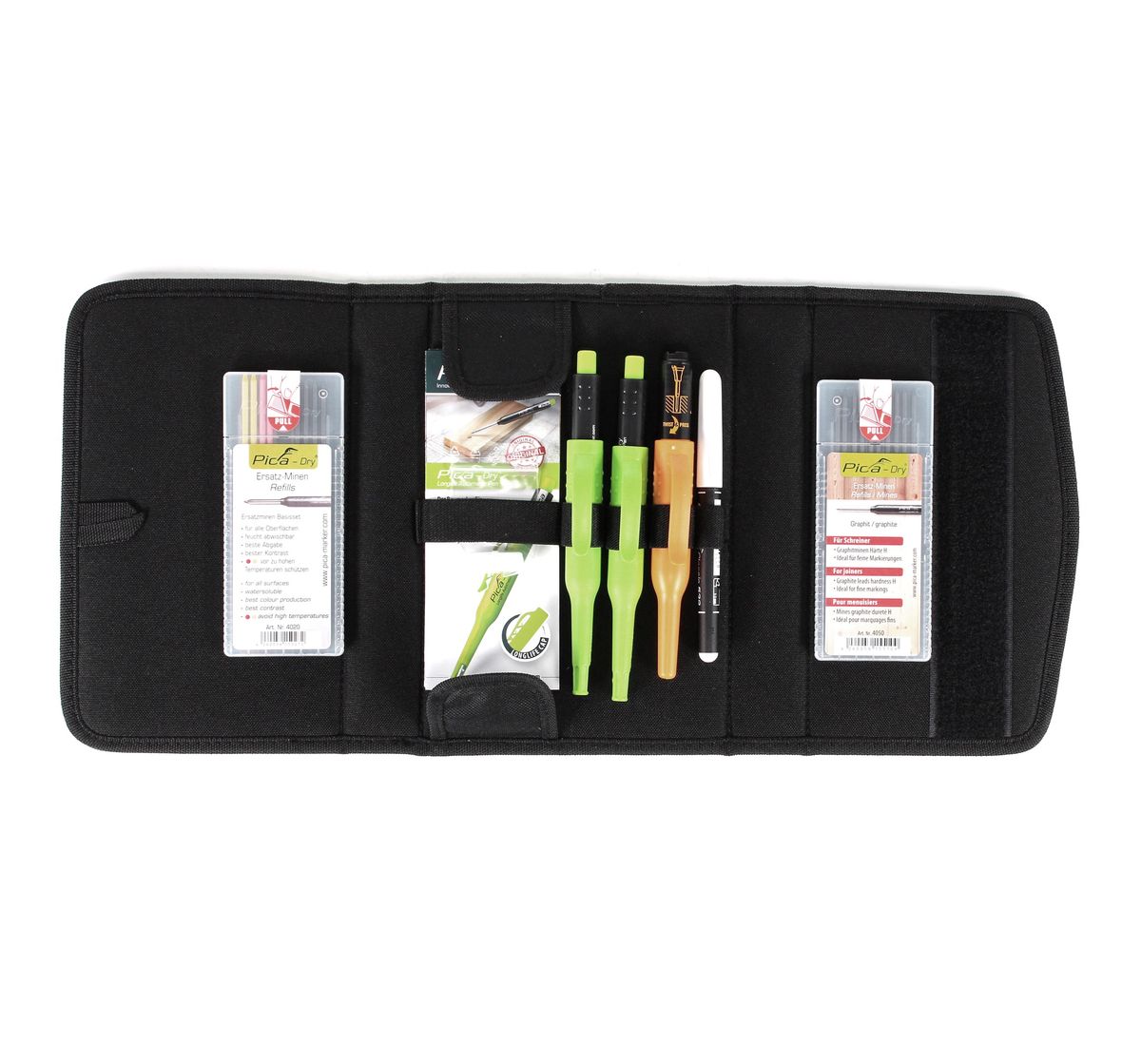 Das Pica Master Set für Schreiner ist ein praktisches und kompaktes Makier-Set. Es eignet sich auch perfekt für Tischler und Monteure. Das Set zeichnet sich in Langlebigkeit und einfacher Funktionsweise aus. Das Set ist mit verschiedenen Minen für unterschiedliche Zwecke nach füllbar und somit universell einsetzbar. Die Minen sind optimal zum Anzeichnen geeignet und zeichnen sich durch eine extrem lange Markierungsleistung aus.