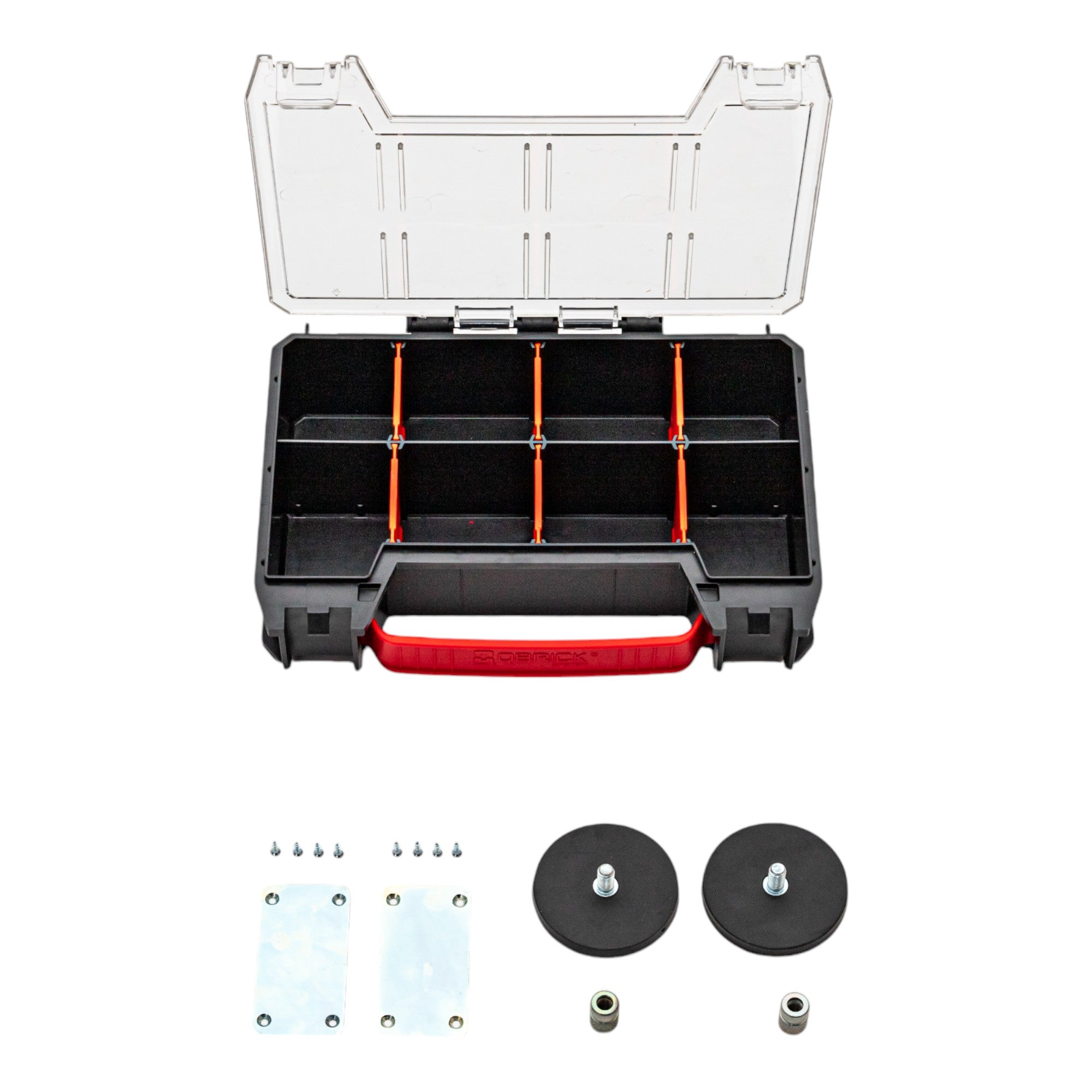 The Qbrick System Custom Magnetic Set offers an innovative solution for attaching magnetic tools such as hammers, spanners, spirit levels or files to tool cases. Thanks to the rubberised magnets, tools can be attached securely and within easy reach. In addition, mountable metal plates allow cases, such as the PRO Organiser Multi, to be attached magnetically. This system is only compatible with the Qbrick systems ONE 2.0, PRIME and PRO 2.0.