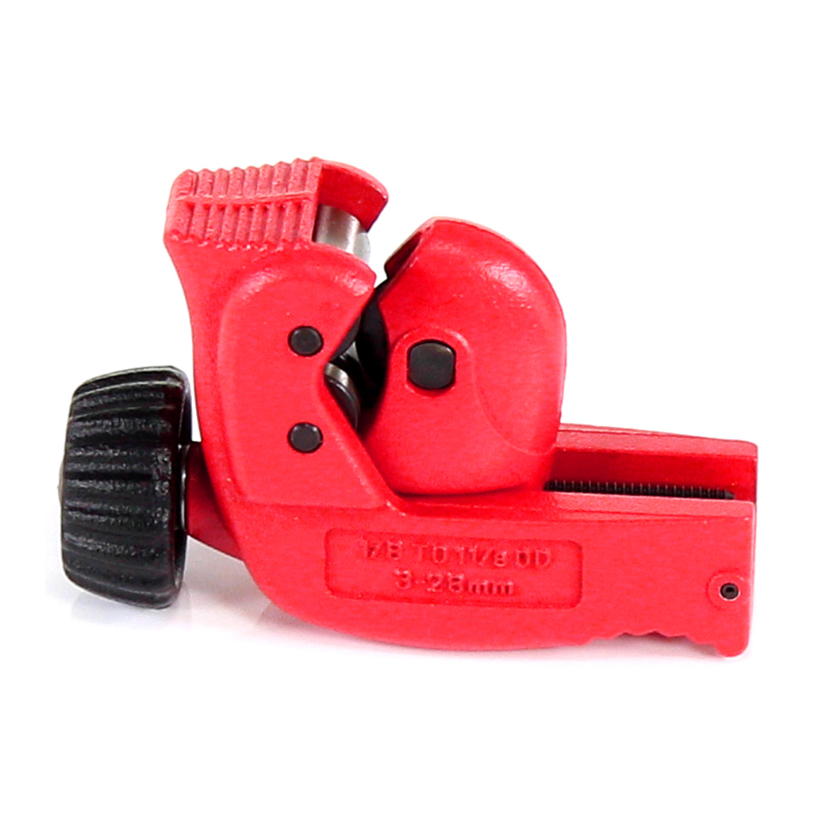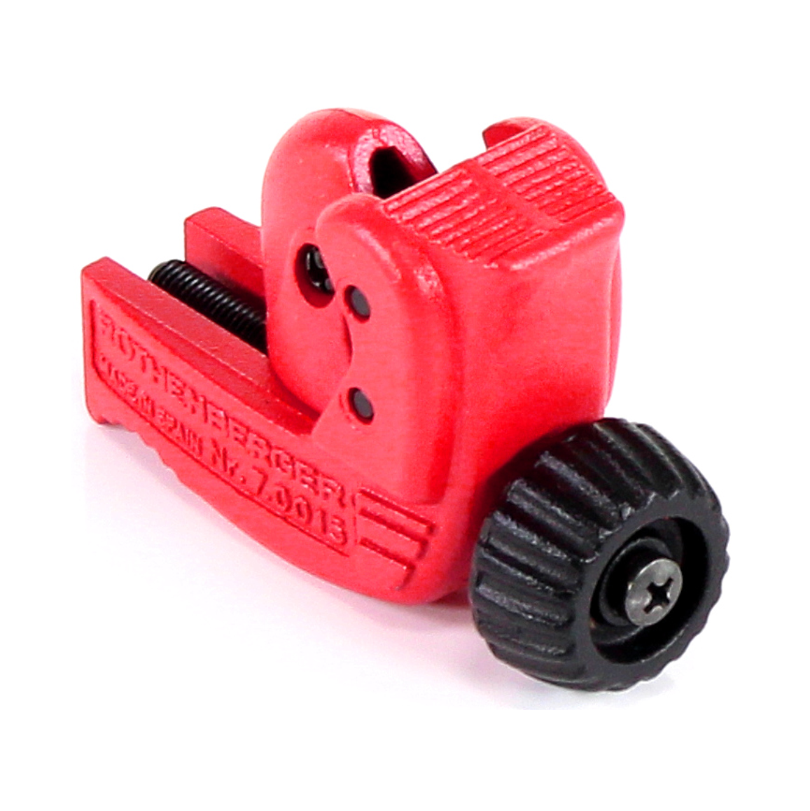 Der Rothenberger MINI MAX Rohrschneider eignet sich für Kupfer-, Messing-, Aluminium und dünnwandige Stahlrohre mit einem Durchmesser von 3 - 28 mm. Er besteht aus handlicher Bauform mit sehr kleinem Arbeitsradius. Durch den großen Rändelknopf besitzt er eine mühelose Druckregulierung und zwei Stützrollen mit Einstich für bördelnahen Schnitt.