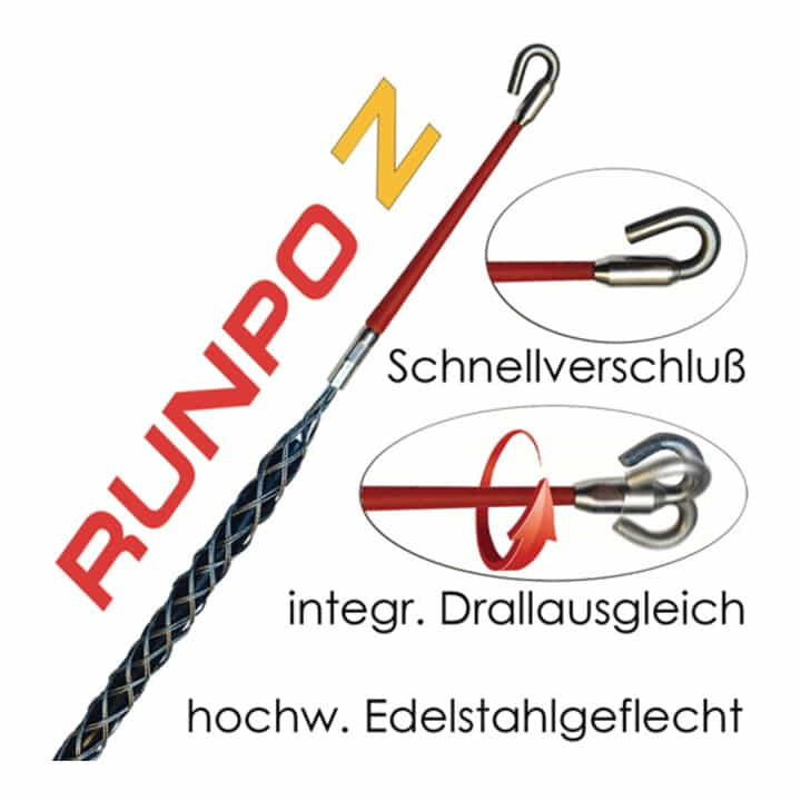 with twist compensation - the quick-release fastener, an ergonomically shaped hook, makes it possible to attach and retract the cable in seconds, eliminating the need for time-consuming screwing and unscrewing - the hook, the connections and the pulling sock braid are made of high-quality stainless steel, which means no rusting and a long service life - the flexible stainless steel double braid enables a cable diameter of Ø 9 - 15 mm to be accommodated - instead of two conventional pulling socks, the RUNPO Z