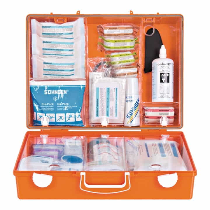 mobile and stationary use especially for building construction and civil engineering, road construction and maintenance companies, demolition and renovation companies, landscaping and gardening - impact-resistant case shell made of ABS plastic - incl. wall bracket with 90° stop lock - case colour: orange This case complies with DIN 13157-2021 - with additional filling! Additional contents: increased aluderm®-aluplast plaster content, aluderm® dressings, oculav NIT® eye wash, splinter tweezers, SÖHNGEN® cooling spray, wound cleaning set, etc.
