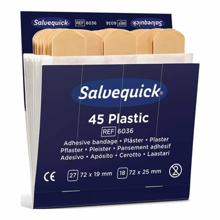 suitable for all Salvequick plaster dispensers art. no. 4706 000 190, 4706 000 235, 4000 386 470, 4000 386 480 - art. no. 4000 386 489: 45 waterproof plastic plaster strips in 2 widths