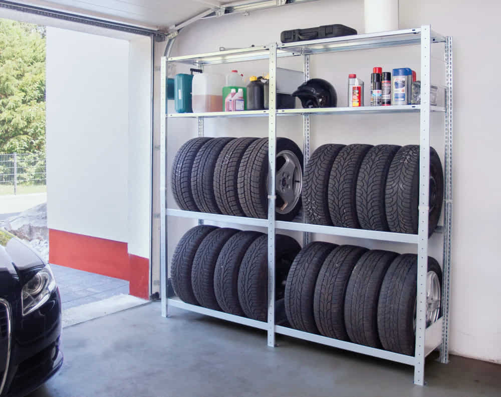 reifenschonende Lagerung durch optimierte Reifentraversen · schnelle Montage durch schraubloses Stecksystem · mit geteilten T-Profilen · verzinkt · speziell geformte Traversen, höhenverstellbar im 25-mm-Raster · 2 Räderebenen und 2 Fachböden mit je 150 kg Fachlast · Feldlast max. 600 kg Sicherheitshinweis: Regale mit einem Höhen-/Tiefenverhältnis größer 5:1 müssen gem. DGUV-Regel 108-007 durch geeignete Wand-, Fuß- oder Deckenbefestigungen gegen Kippen gesichert werden.