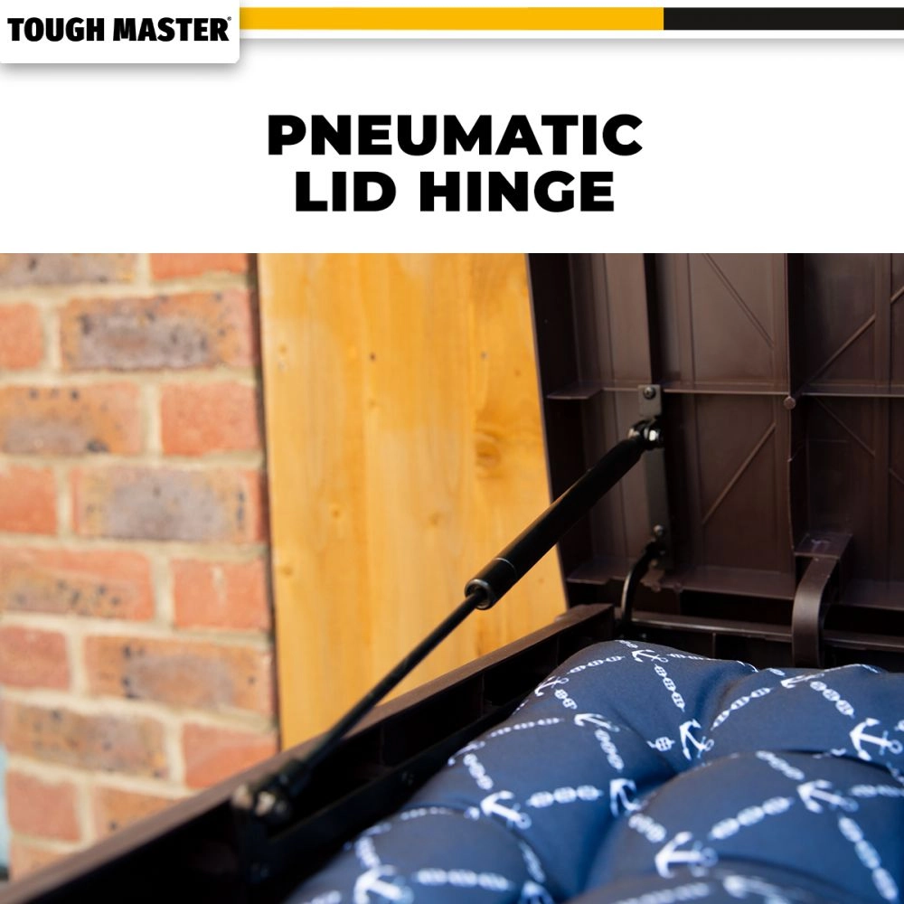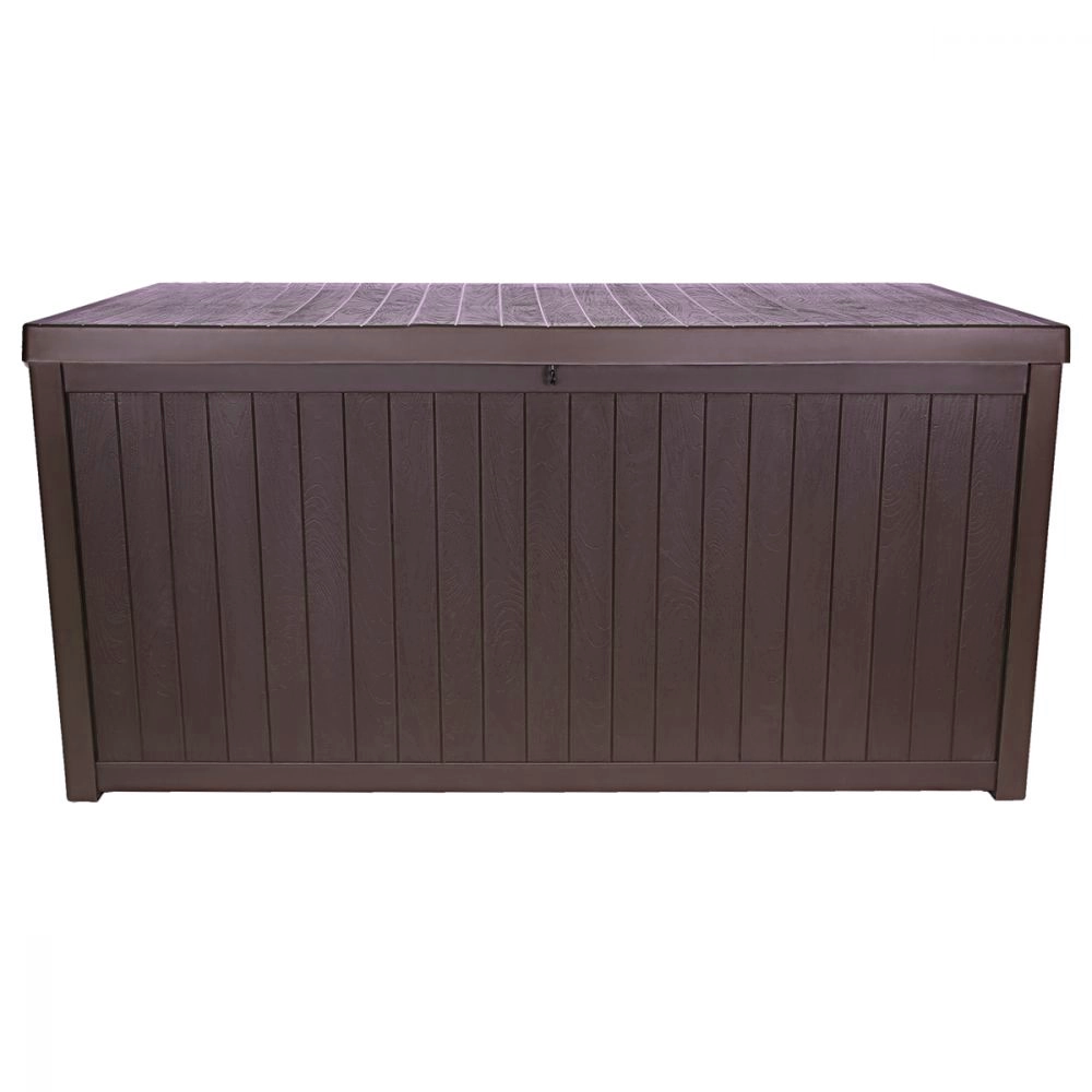 Mit der 430-Liter-Aufbewahrungsbox TM-SBW43H bietet TOUGH MASTER eine großartige Lösung zur sicheren, trockenen und ordentlichen Aufbewahrung Ihrer Produkte für den Außenbereich, wie z.B. Kissen, Unterlagen, Spielzeuge, Werkzeuge und was Sie sonst gerne im Garten oder auf Ihrer Terrasse verstauen möchten. Diese Aufbewahrungstruhe ist robust, sowie langlebig und besteht aus wasserdichtem, wetterfestem Polypropylen, welches die Eigenschaft besitzt nicht zu rosten, sich abzulösen oder zu verbeulen. Hinzu kommt die attraktive Oberflächenstruktur in Holzoptik, mit einem sehr schönen Farbton in dunklem Kaffeebraun, was diese Box zu einem echten Hingucker macht. Des Weiteren gestaltet sich die Reinigung der Kunststoffoberfläche sehr einfach, wodurch das Sauberhalten der Aufbewahrungskiste zum Kinderspiel wird. Damit Sie diese Outdoor-Kiste einfach und sanft schließen können, wurden den Gelenken zwei pneumatische Deckelscharnierstützen hinzugefügt. Um diese Box von einem Ort zum anderen zu bewegen, können Sie die zwei bequemen Seitengriffe verwenden, welche Ihnen einen sicheren Halt während des Transports bieten. Zu den Vorteilen dieser Auflagenbox gehört der integrierte Riegel, an welchem ein Schloss angebracht werden kann, um den Inhalt zusätzlich zu sichern. Die Montage der Auflagenkiste gestaltet sich ebenfalls sehr einfach und nimmt nur wenige Minuten in Anspruch. Zusammengefasst bietet die große TM-SBW43H Auflagentruhe die optimale Ergänzung für Ihren Garten, Balkon oder Ihre Terrasse.