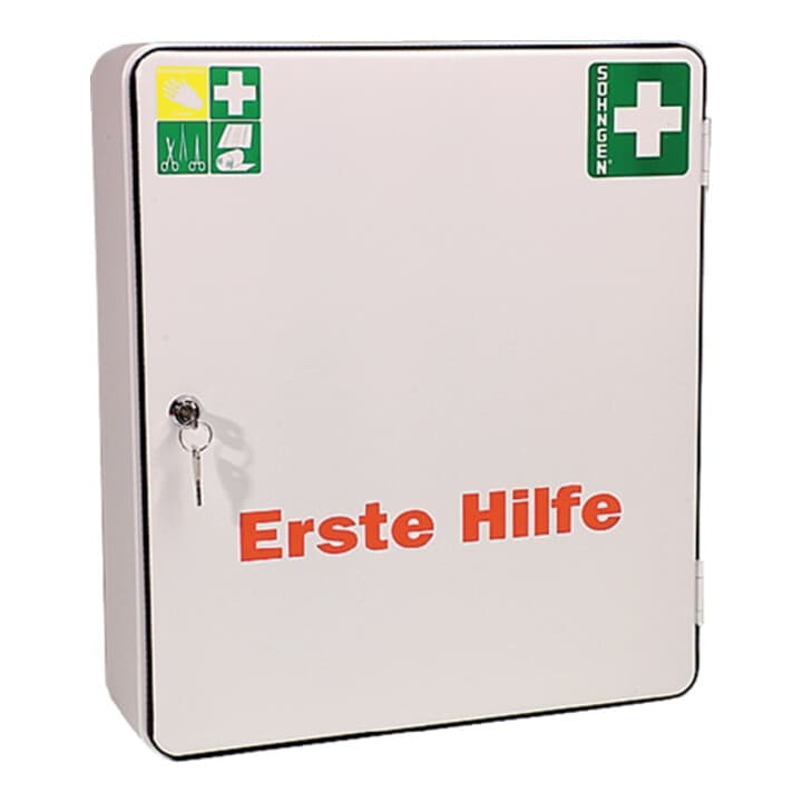 de chapa de acero, blanco - 1 puerta - cerradura de seguridad, 2 llaves - 3 compartimentos interiores - bandeja de almacenamiento adicional abatible para el almacenamiento temporal higiénico de material de vendaje durante los primeros auxilios - ampliable con 1 compartimento para medicamentos y 1 estante adicional relleno adecuado según DIN 13157 ver Nº de artículo 4000 386 101