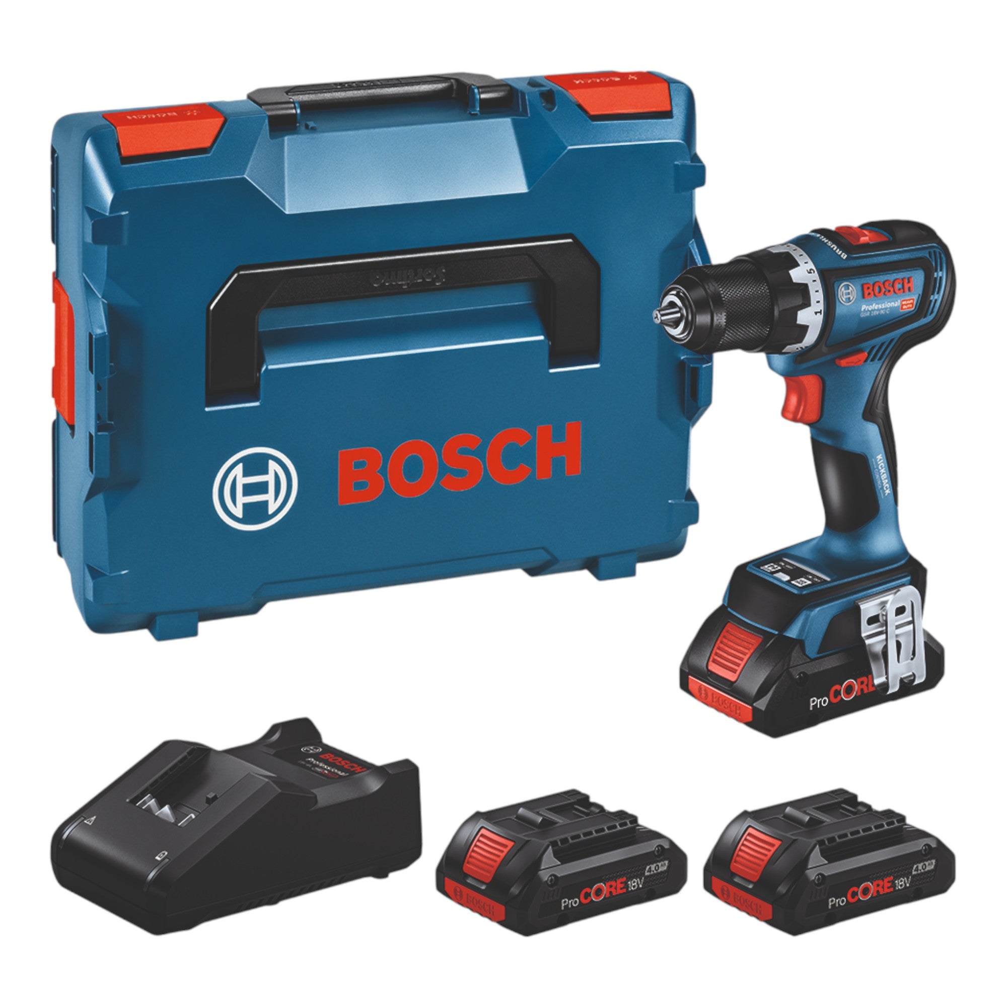 Bosch GSR 18V-90 C Taladro atornillador profesional a batería 64 Nm 18V sin escobillas + 2 baterías ProCORE 4,0 Ah + cargador + maletín L-Boxx