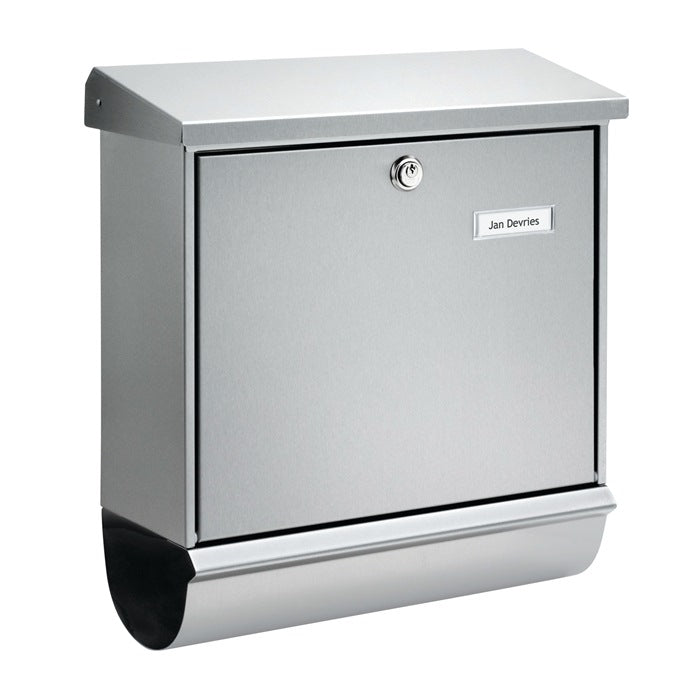 de acero inoxidable con mucho espacio para cartas, catálogos y periódicos - de acero inoxidable natural, limpiado a mano - con tope de apertura para sacar el correo de forma fácil y segura - con iluminación interior - formato de inserción DIN C4 - juego (39130 Ni) compuesto por un buzón con caja para periódicos montada, abierta por ambos lados