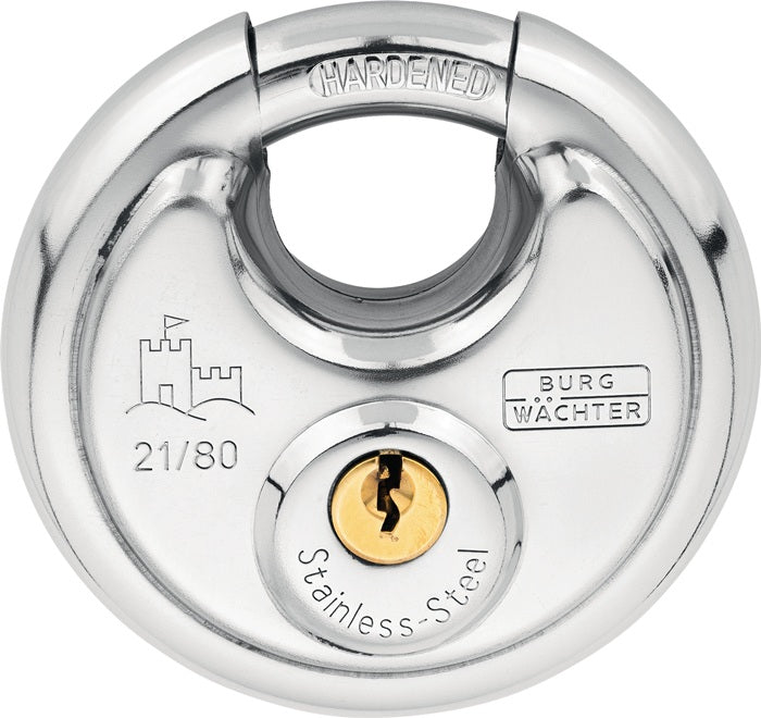 Circle 21 - La práctica cerradura de arco redondo de acero inoxidable Robusta, duradera y fácil de usar: El candado de grillete redondo Circle 21 asegura puertas, verjas y todos los demás objetos que puedan cerrarse con llave. Al fin y al cabo, las bicicletas, las herramientas de jardín y otros objetos no deben convertirse en presa fácil. El cuerpo del candado es de robusto acero inoxidable. Esto lo hace muy resistente a la corrosión. E incluso después de mucho tiempo, no tendrá problemas para abrir y cerrar el candado con seguridad. Puntos de ataque contra el ganzuado minimizados ¿Qué ventajas ofrece un candado de arco redondo como el Circle 21 de BURG-WÄCHTER? Muy sencillo: gracias a la forma especial del disco y al diseño del grillete, apenas existen puntos de ataque para las herramientas de apertura habituales. Esto se debe a que el grillete está prácticamente oculto en el cuerpo de la cerradura. Además, el grillete de la Circle 21 está endurecido y cromado. Así lo indica la inscripción "Hardened" grabada en el grillete. Circle 21 en dos tamaños: posibilidad de llave idéntica La cerradura de arco redondo está disponible en dos tamaños. El modelo 21 60 tiene un diámetro de 60 mm, mientras que el modelo 21 70 tiene un diámetro de 70 mm. Naturalmente, esto se traduce en diferentes anchuras y alturas de grillete. Así que seguro que encuentra el tamaño adecuado para su aplicación individual. Además, ambos modelos están disponibles con la misma llave. Esto significa que puede abrir varias cerraduras de grillete redondo con una sola llave. Esto pone fin a la búsqueda de la llave adecuada. Hablando de llaves: el cilindro de pasador de precisión hace que abrir y cerrar el candado sea extremadamente cómodo. El candado Circle 21 también está fabricado en latón. Esto proporciona un atractivo contraste visual con el cuerpo de acero inoxidable. El candado se suministra de serie con dos llaves.