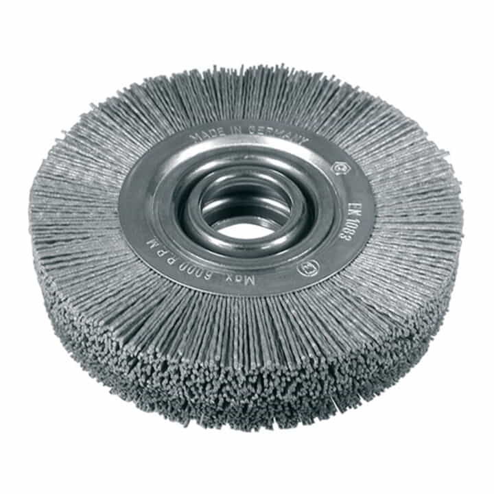 Cepillo abrasivo redondo de nylon con carburo de silicio para acabado - para uso en pulidoras y máquinas CNC - 31,75 mm Ø agujero - Ventajas: efecto abrasivo uniforme, ya que se libera constantemente nuevo material abrasivo a medida que se desgasta el material de soporte gran elasticidad y flexibilidad sin riesgo de rotura no se obstruye la superficie del filamento con residuos de trabajo adecuado para trabajos en húmedo y en seco, ya que el nylon no absorbe cantidades significativas de refrigerante o lubricante resistente a ácidos débiles y álcalis no es necesario volver a cortar el filamento para un uso normal larga vida útil en condiciones óptimas velocidad adecuada (22 m/seg) baja presión de contacto baja generación de calor campos de aplicación: Eliminación de óxido ligero de carrocerías de automóviles Desbarbado y lijado fino de laminados, placas de circuitos impresos y circuitos impresos Desbarbado de rebabas de corte y punzonado Plástico, desbastado y mateado Lijado de madera y contrachapado