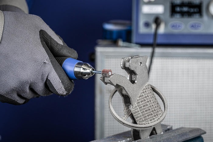 - Ventajas: Adaptación óptima al contorno gracias a su gran flexibilidad. Se puede utilizar muy cerca de bordes y en ángulos gracias al diseño plano del núcleo de fundición. Elevado rendimiento de arranque de material constante durante toda la vida útil, ya que se libera constantemente abrasivo nuevo y agresivo.