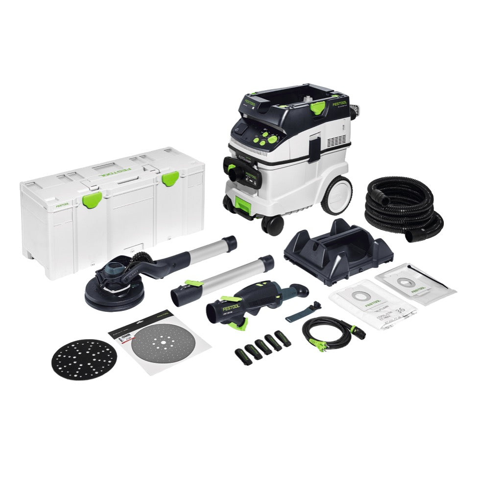 Extensión VL-LHS 2 225, abrazadera para manguera SC-LHS 2 225, conector de velcro KV-215 (paquete de 5), paquete de 5 Granat P180, placa de lijado de Ø 220 mm con almohadilla de interfaz, cable de alimentación enchufable (4 m), Systainer SYS3 XXL 337, aspirador de polvo móvil CTM 36 E AC PLANEX