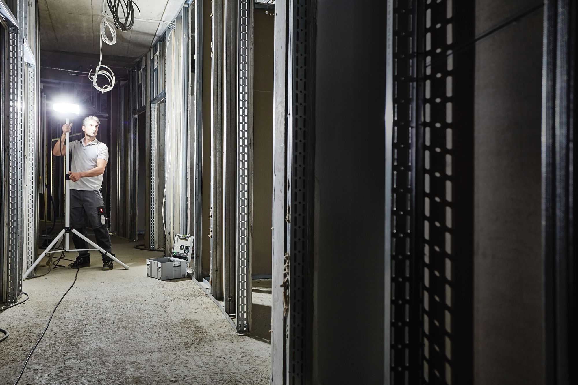 El proyector para la construcción SYSLITE DUO de Festool convence por su exclusiva disposición de LED para un ángulo de dispersión de 180° y una iluminación homogénea. La alta luminosidad de 8000 lúmenes consigue una iluminación excelente en una gran superficie con un color de luz de 5000 K similar a la luz diurna. El proyector para la construcción de Festool es robusto y duradero y, además, tiene una vida útil de hasta 10.000 horas. Syslite DUO es resistente al polvo, al agua, a las caídas y a los golpes. Todas las superficies de contacto se calientan hasta un máximo de 90 °C y la longitud del cable de 4,8 m garantiza un gran alcance, lo que se traduce en un manejo perfecto durante el trabajo. El foco para la construcción puede montarse en posición vertical sobre el suelo o sobre superficies, en el trípode de Festool o en ganchos con la opción de suspensión en la parte posterior. Festool es un fabricante líder de herramientas eléctricas, caracterizado por una larga tradición y una alta calidad de sus productos.