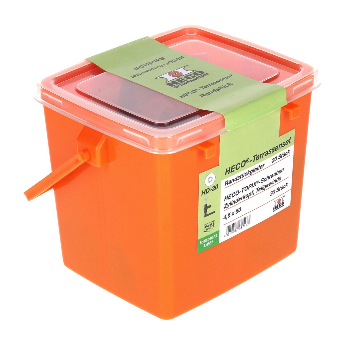 Juego de deslizadores para terraza HECO pieza de borde 30 piezas (48717) con tornillos HECO TOPIX 4,5 x 50 mm HD 20 en caja de plástico