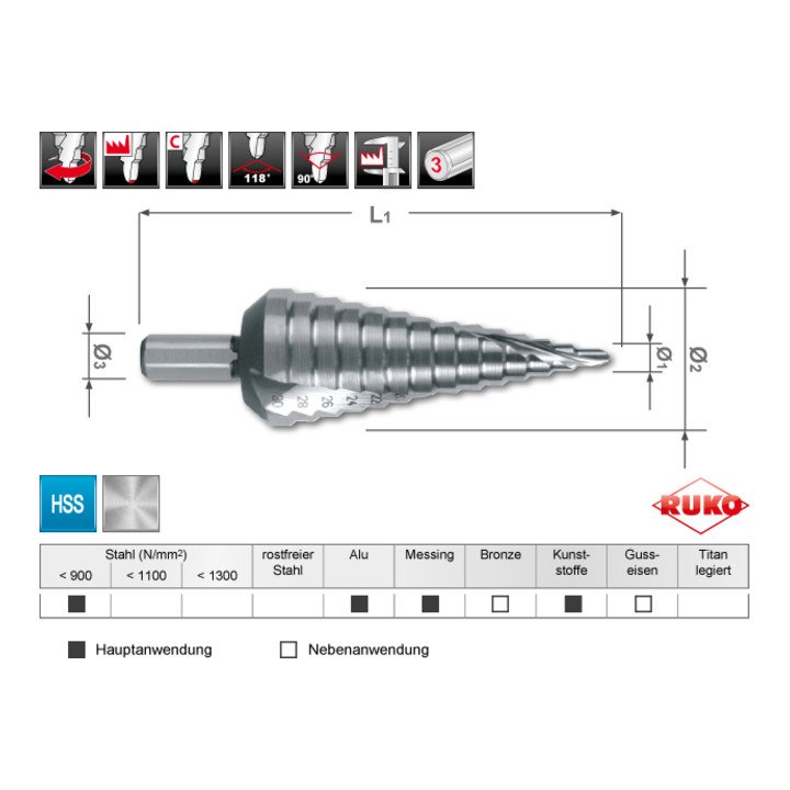 Juego de brocas escalonadas RUKO Ø 4-12/4-20/4-30 mm ( 4000601745 )