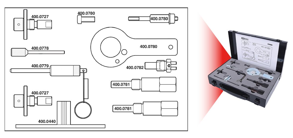KS TOOLS Juego de herramientas de reglaje de motores para GM / Opel / Saab, 11 pzs ( 400.0775 )