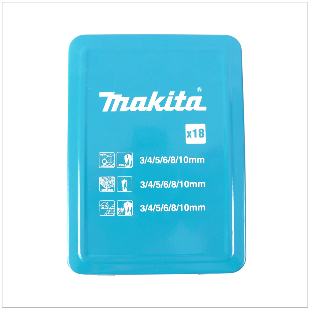 El juego de brocas Makita incluye 18 cabezales diferentes, cada uno en 6 tamaños diferentes, adecuados para taladrar madera, metal y piedra. El juego de brocas se entrega en una pequeña caja metálica de Makita, con un dispositivo de montaje para cada cabezal de perforación.