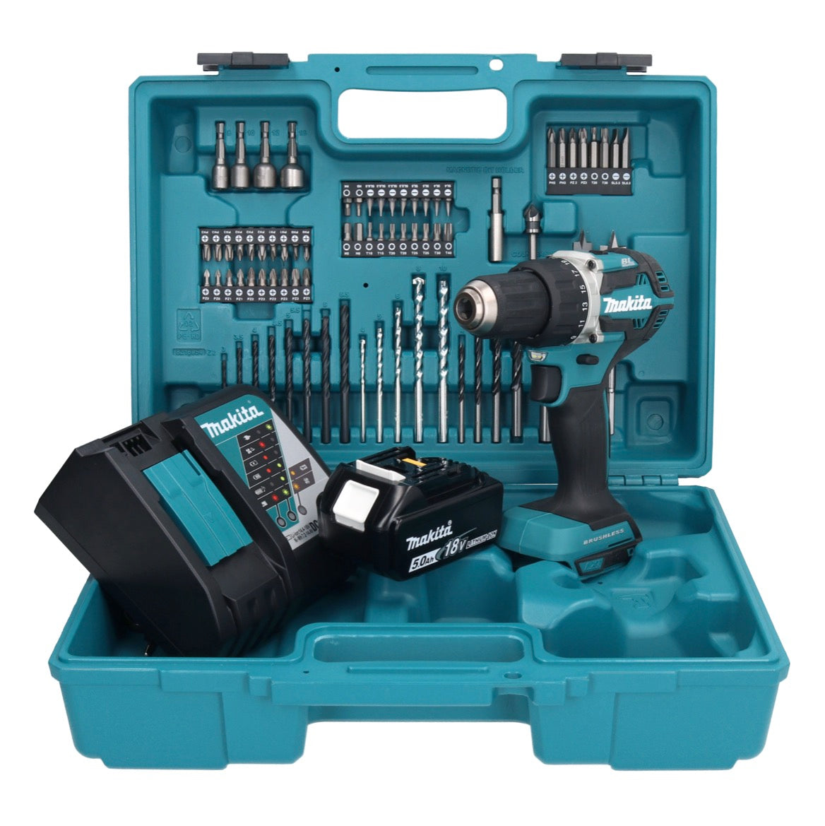 Makita DDF 484 RT1X1 taladro atornillador inalámbrico 18 V 54 Nm + 1x batería 5,0 Ah + cargador + set de accesorios 74 piezas + estuche