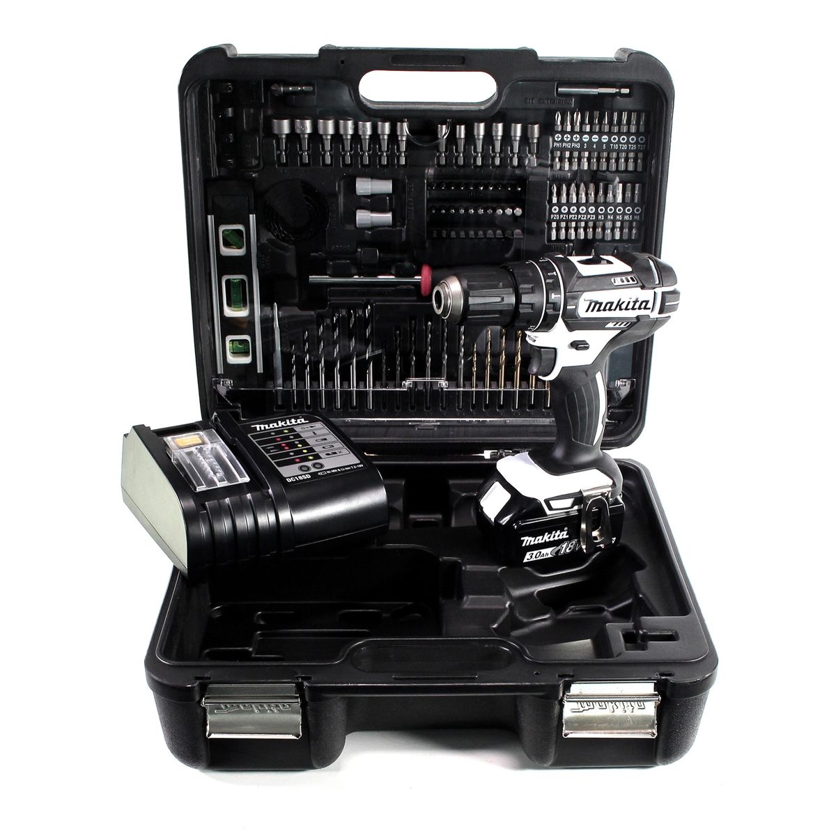 Taladro percutor inalámbrico Makita DHP 482 SFTKW 18 V 62 Nm + 1x batería 3,0 Ah + cargador + set de accesorios 101 piezas + estuche