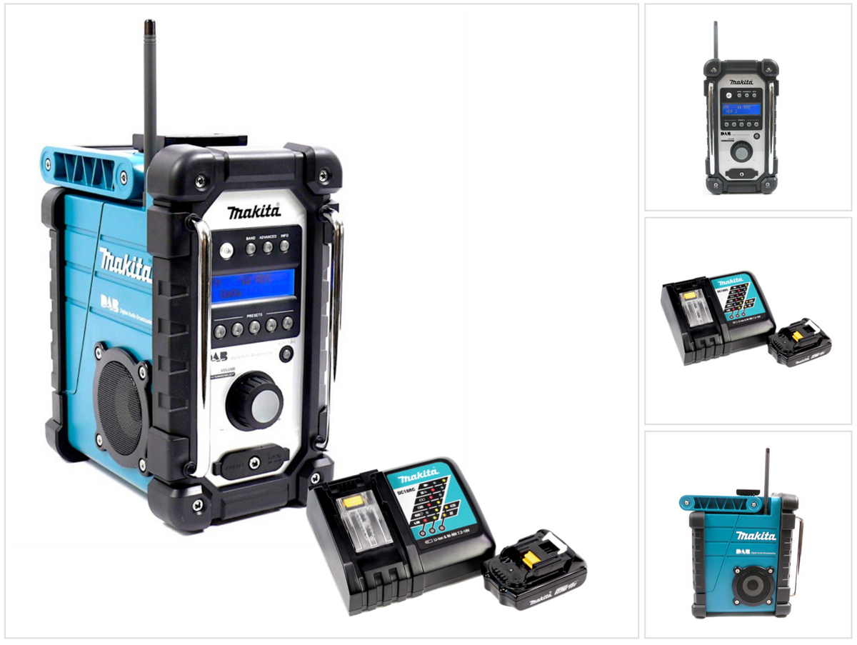 La radio DMR 104 W, perfecta para obras, convence por su alta calidad de sonido de los altavoces estéreo de 3 pulgadas y la robustez de la carcasa. La carcasa, que está equipada con un asa de transporte, está recubierta de goma en los bordes exteriores y todas las aberturas están cerradas y son a prueba de polvo y suciedad. Además, se garantiza la protección contra salpicaduras de agua por todos los lados de acuerdo con IPX 4. La radio de obra recibe los canales de la gama FM / DAB a través de una antena de varilla flexible suministrada. Una gran pantalla LCD con iluminación permite un fácil ajuste manual o totalmente automático del transmisor. La búsqueda del transmisor y el control de volumen se controlan mediante un mando giratorio y reducen al mínimo el manejo de la radio. Se pueden preseleccionar hasta 5 emisoras en cada banda. Si la música que desea no está en la radio, el DMR 104 también tiene conexiones AUX y Micro USB para conectar su iPod, MP3 o reproductor de CD. La radio puede ser operada con baterías estándar Makita de 7.2 - 18 Voltios o con el adaptador de red suministrado.