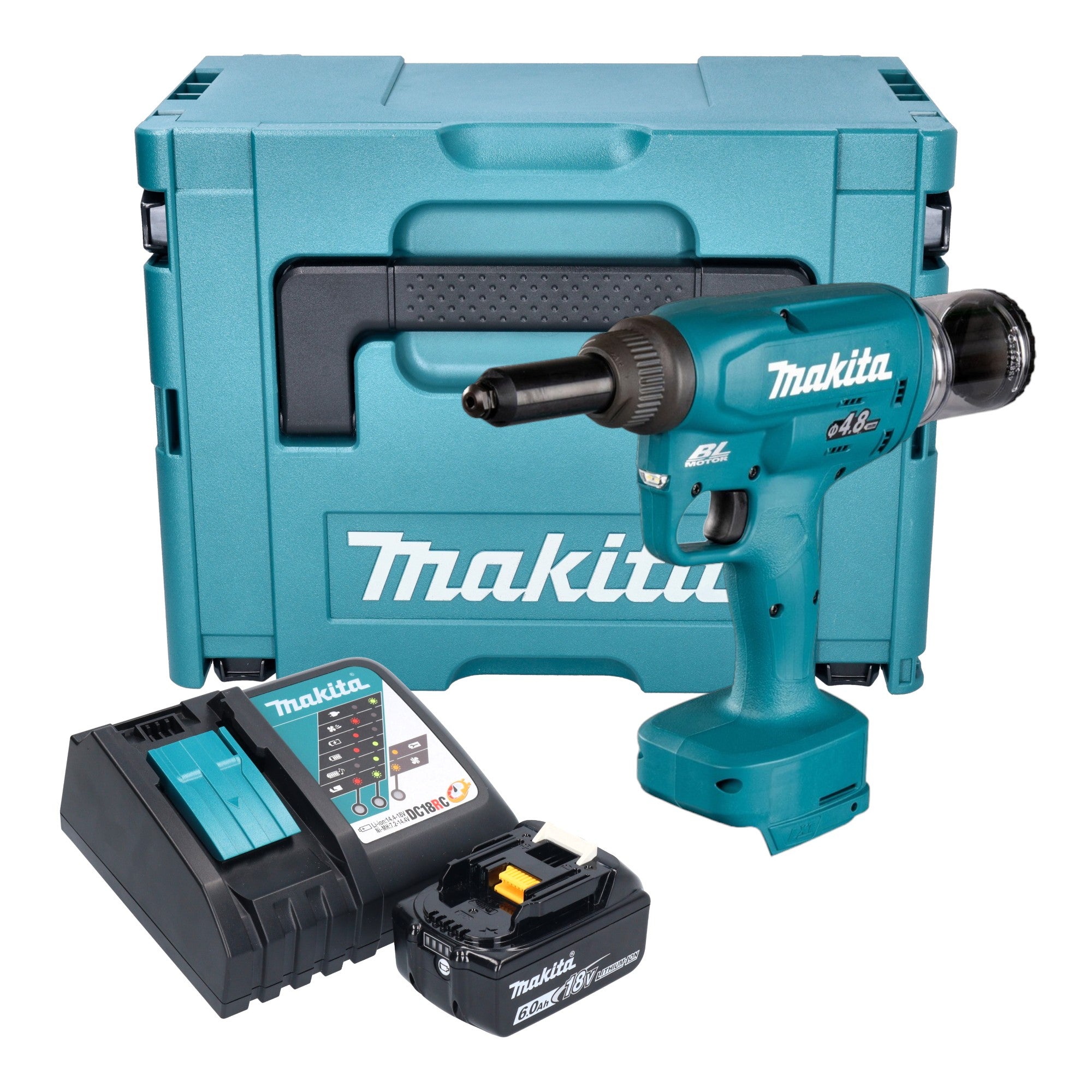 Makita DRV 150 RG1J Remachadora a batería 18 V 10 kN 2,4 - 4,8 mm sin escobillas + 1 batería de 6,0 Ah + cargador + Makpac
