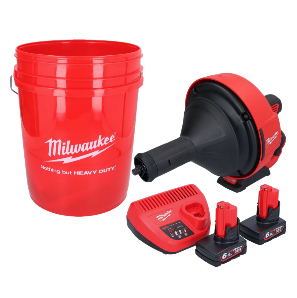 Limpiador de tuberías a batería Milwaukee M12 BDC8-602C 12 V + 2x baterías 6,0 Ah + cargador + espiral + cubo