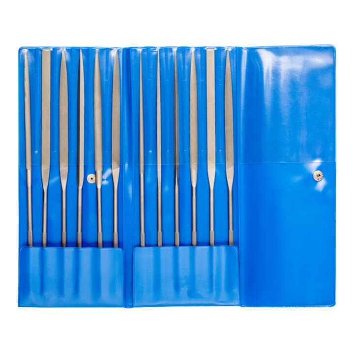 en bolsa de plástico - Contenido: plano romo, plano puntiagudo, lengua de pájaro, triangular, cuadrado, redondo, cuchillo, media caña, boina, plano puntiagudo con bordes redondos, plano romo con bordes redondos, lengua de pájaro redonda ovalada