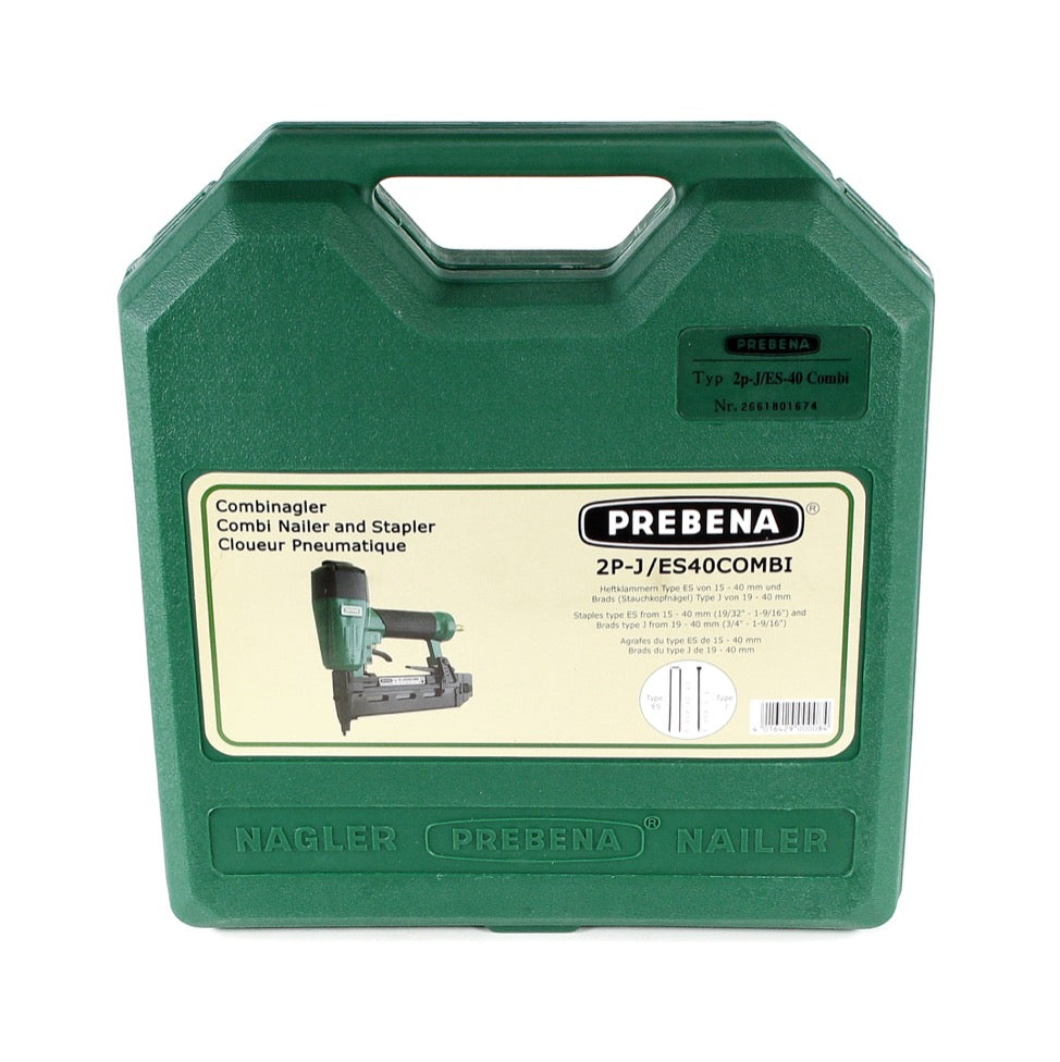 Prebena 2P-J/ES 40 COMBI Clavadora de aire comprimido / 5 bis 7 Bar + Maletín de transporte + Prebena J 40 CNKHA Clavos con cabeza retráctil 40 mm / 5000 unidades