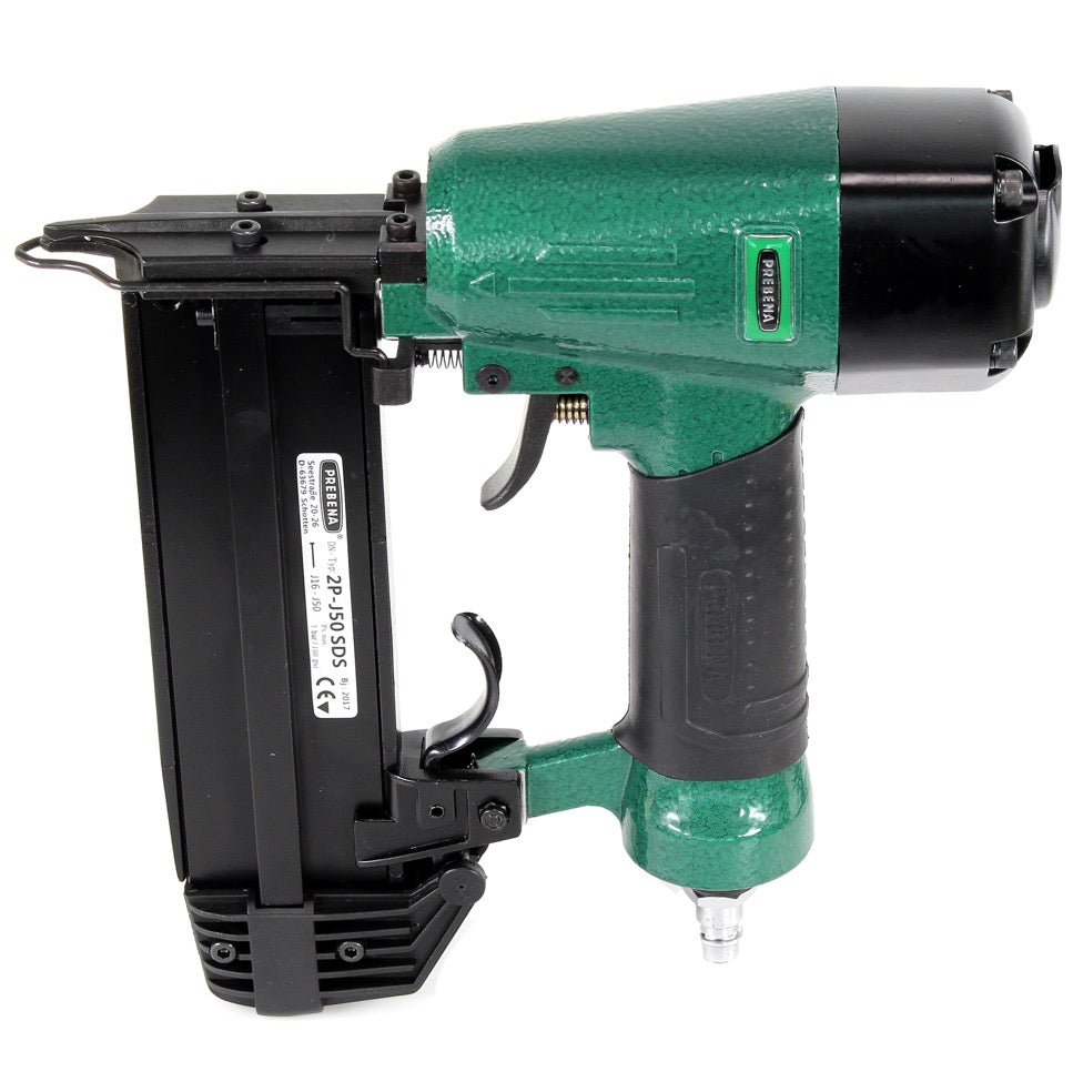 La clavadora neumática de Prebena, modelo 2P-J50SDS, se suministra en un práctico maletín de transporte. Es adecuada para clavos verticales de tipo J de 16 - 50 mm. Con una presión de trabajo de 5 - 7 bar, la 2P-J50SDS es ideal para una amplia gama de aplicaciones como tapicería, decoración, zócalos, molduras de techo, marcos de cuadros, molduras decorativas, junquillos, molduras y mucho más. El dispositivo de seguridad del gatillo y el silenciador garantizan un trabajo cómodo y seguro.