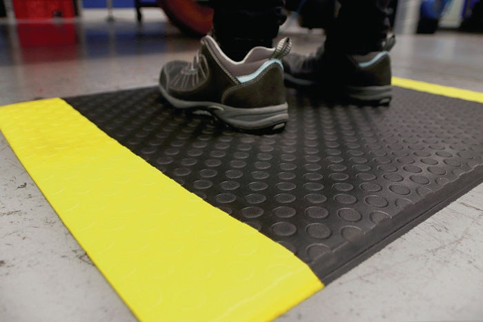 estera ergonómica de una capa para puestos de trabajo (de espuma) con superficie de tacos antideslizante - ideal para puestos de trabajo con cargas bajas a medias - adecuada para zonas interiores secas - tiene un efecto aislante del frío en suelos de hormigón - los bordes biselados de la estera reducen el riesgo de tropiezos - con bordes amarillos para mejorar la visibilidad - protección contra incendios probada según BS EN 13501-1 - grosor de la estera 9,5 mm