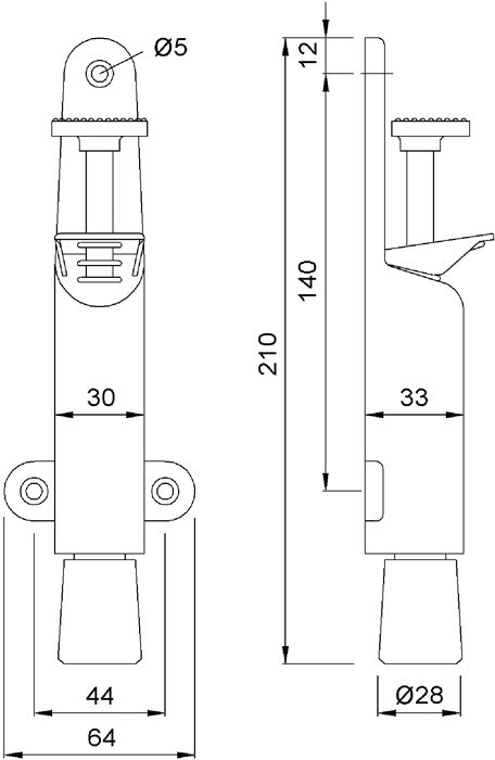 de acero - lacado en color plata - fijación a la puerta - distancia del borde inferior de la puerta al tope: 5-10 mm - peso de la puerta aprox. 40 kg - 30x210 mm - 33 mm de profundidad - tope de goma negro - el contra muelle instalado de serie aumenta la presión de contacto con el suelo