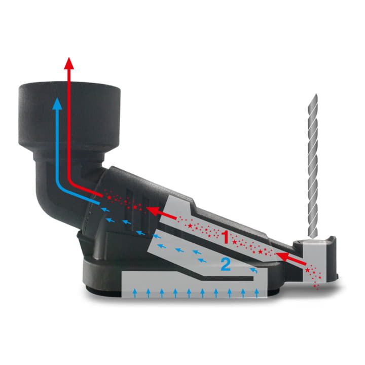 el accesorio aspirador para aspirar el polvo de taladrado directamente en el taladro - sistema patentado de 2 cámaras - trabajo absolutamente libre de polvo - sin restos de polvo de taladrado en la pared - sujeción segura incluso en superficies irregulares y perforadas - no apto para aspiradores con limpieza de filtro según el "principio de retrolavado de aire"