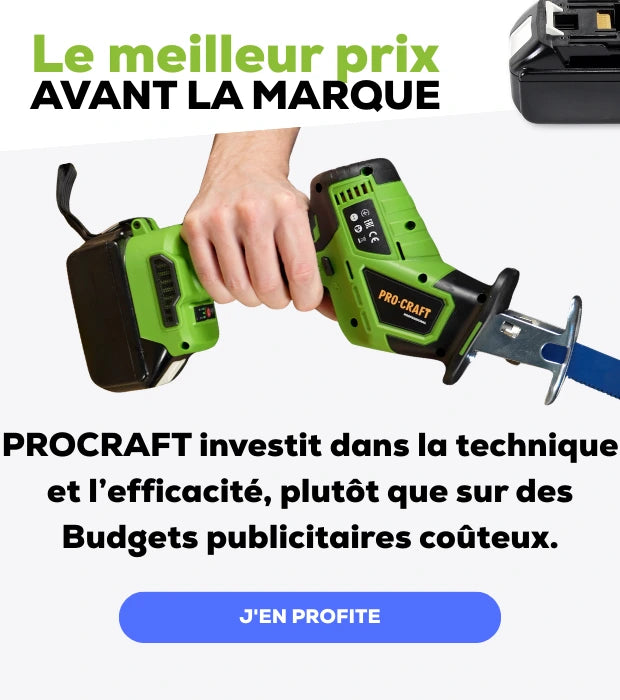 Si vous cherchez un outil fiable sans vouloir financer les campagnes marketing mondiales ou les coûts liés aux changements de systèmes de batteries, PROCRAFT est l’alternative intelligente. Avec PROCRAFT, vous investissez dans la performance de l’outil, pas dans la notoriété du logo.