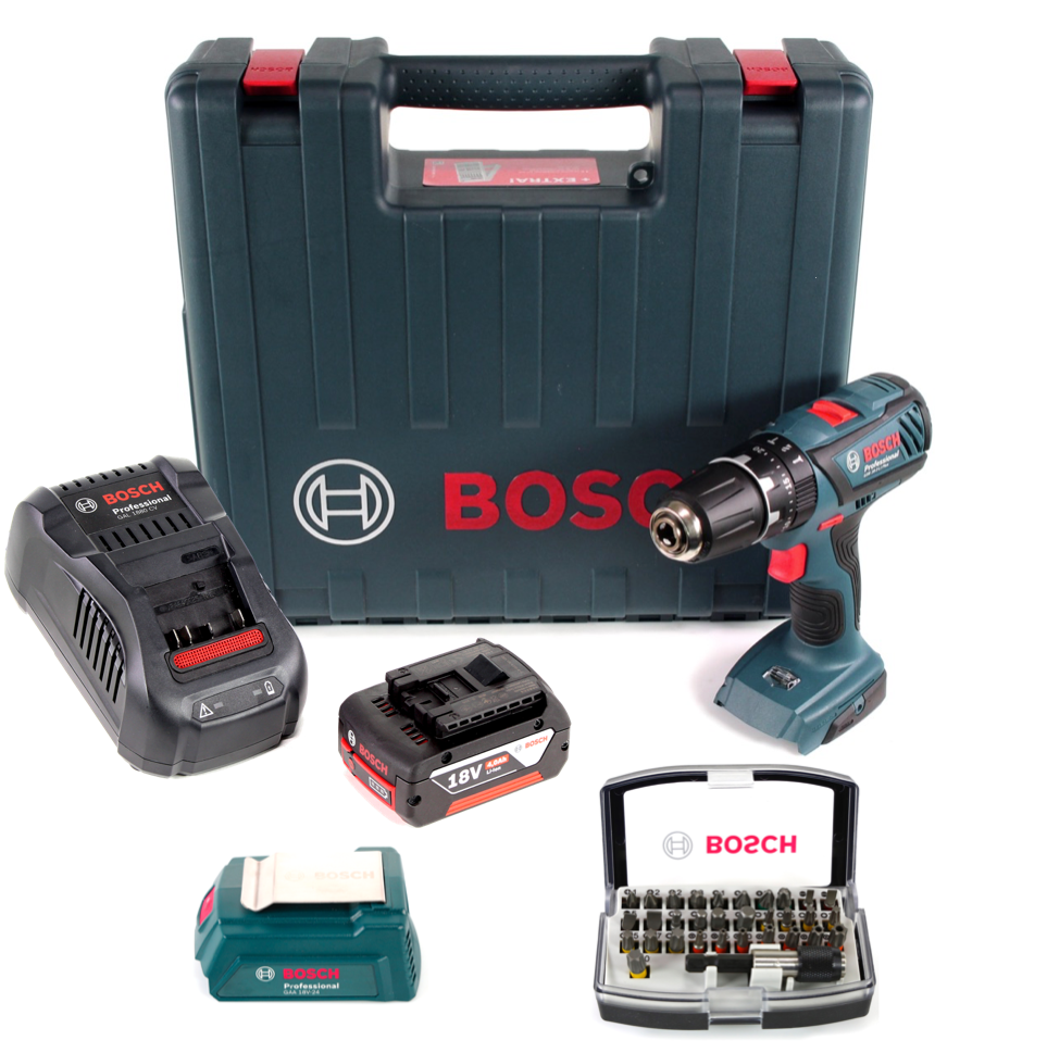 Bosch GSB 18-2-Li Plus Professional 18 V Perceuse-visseuse à percussion sans-fil avec Coffret + 1x Batterie GBA 6,0 Ah + Chargeur GAL 1880 CV + 32 embouts de vissage + Adaptateur USB pour Batterie