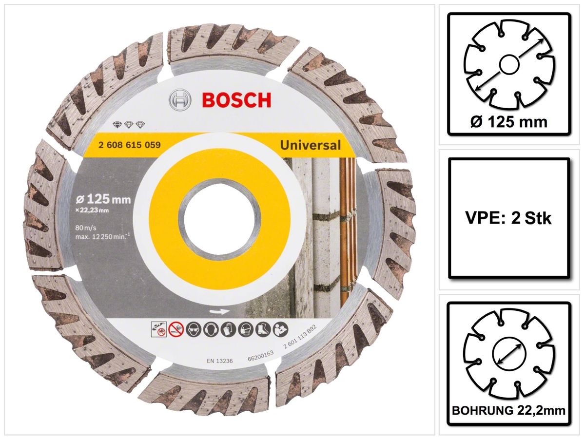Bosch Standard for Universal Disques à tronçonner diamantés 125 x 22,23 mm 2 pces ( 2x 2608615059 ) pour béton, acier-béton, brique, calcaire et sable-pierre