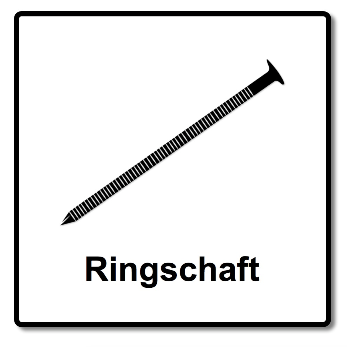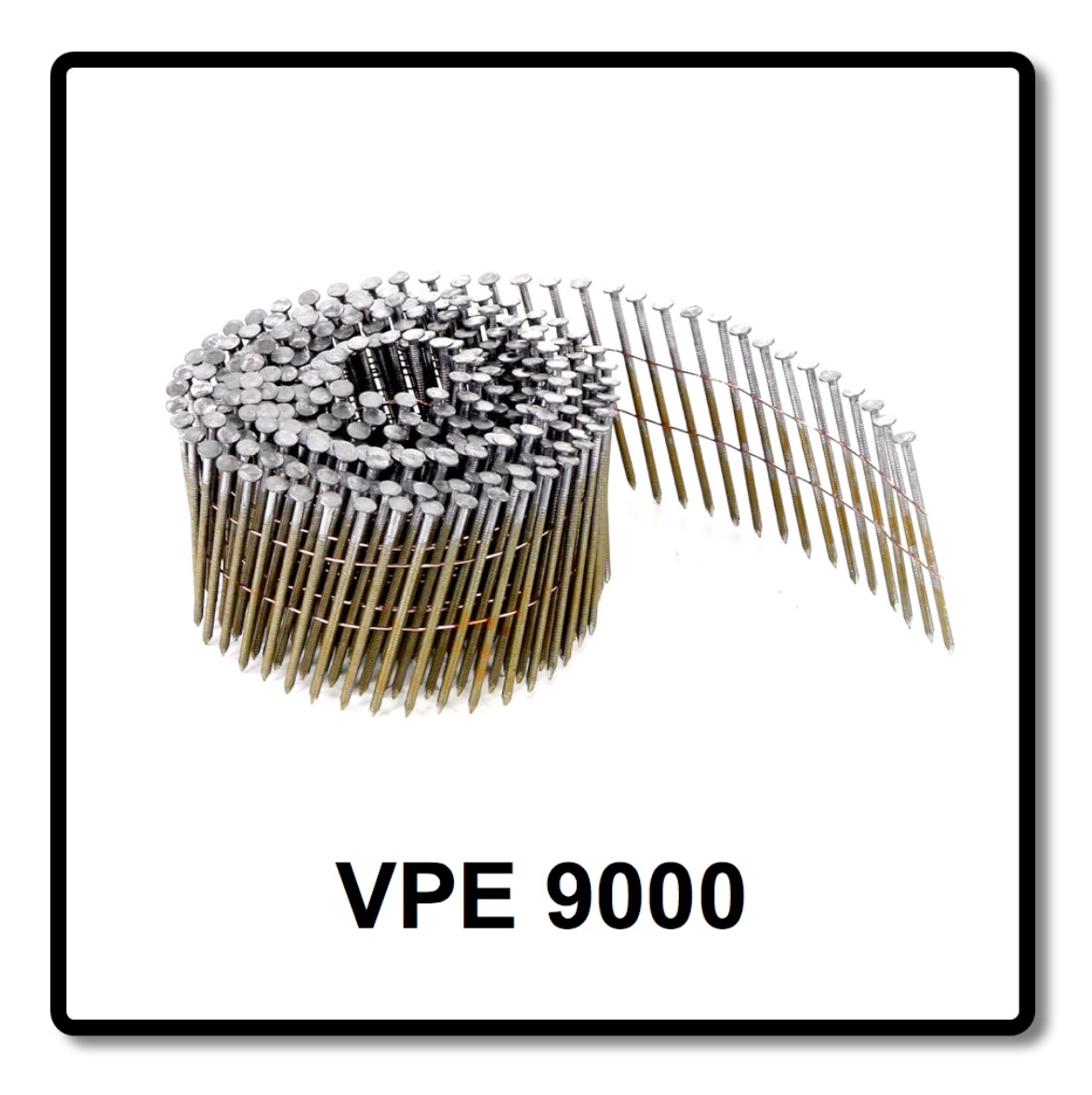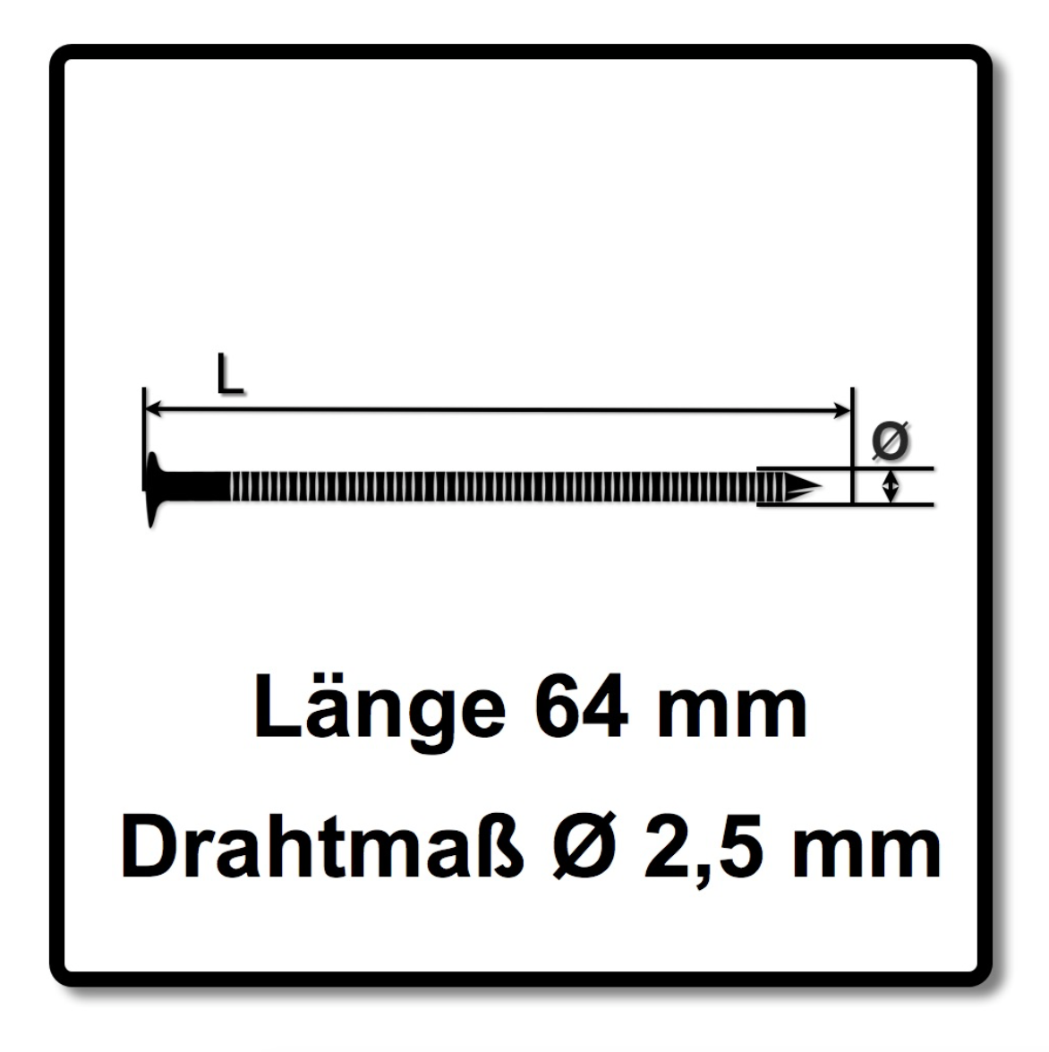 Les clous enroulés Bostitch à tige annulaire ont une longueur de 64 mm, un diamètre de fil de 2,5 mm, une tête de 7,2 mm de large et conviennent à la cloueuse à air comprimé de différents fabricants.