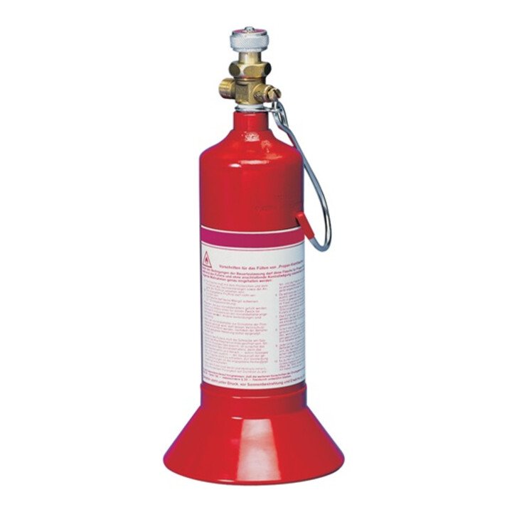 testé par le TÜV - bouteille en acier étiré sans soudure avec pied, valve et crochet de suspension - raccord G 3/8″ LH - remplissable par l'utilisateur lui-même avec un embout de transvasement Réf. 4000 872 099 - capacité 425 g