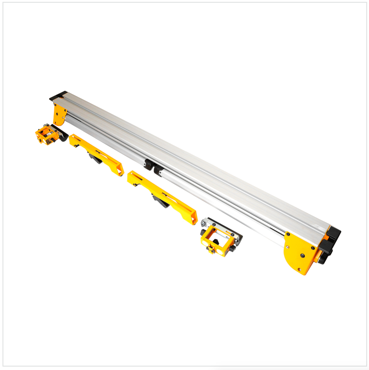 Le support universel DE 7023 de DeWalt convient parfaitement à toutes les scies à onglets et à panneaux de la société DeWalt et d'autres fabricants renommés d'outils électriques. Une poignée de transport intégrée facilite le transport lors des travaux de montage. La construction en aluminium très robuste assure en même temps un faible poids de seulement 16 kg. Le châssis dispose en outre de supports de pièces extensibles, ce qui permet de rallonger le châssis jusqu'à une longueur de travail maximale de 383,54 cm.
