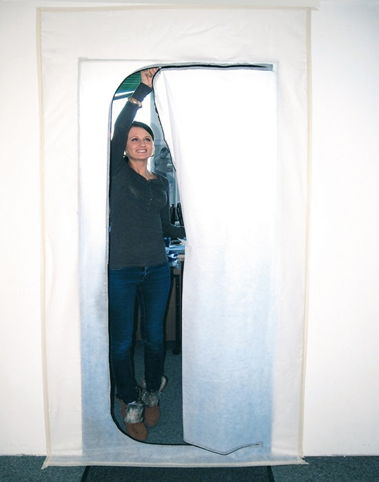 Toile tissée (2,20 x 1,10 m) avec fermeture éclair déjà cousue - fixation avec ruban adhésif fourni (rouleau de 7 m x 25 mm) - séparation anti-poussière entre la zone d'habitation et la zone de chantier