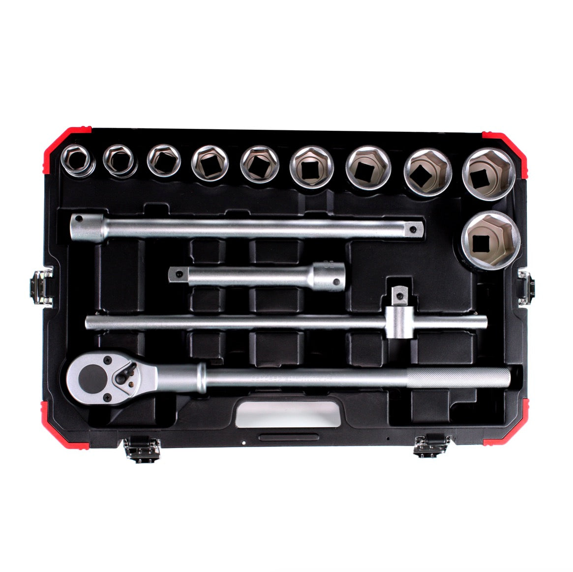 Ce set de clés à douille de Gedore est composé d'un carré d'entraînement selon DIN 3120 - B 20, ISO 1174, avec verrouillage par goupille. En outre, il existe un entraînement intérieur carré conforme à la norme DIN 3120 - D 20, ISO 1174, avec un trou pour le verrouillage des goupilles. Par ailleurs, La douille 3/4" a un entraînement hexagonal, est métrique et courte, conformement à la norme DIN 3124, ISO 2725. Toutefois, Une rallonge de douille 3/4" est également incluse dans le set, ainsi qu'une poignée transversale 3/4" avec pièce coulissante, conformement à la norme DIN 3122, ISO 3315. Les outils sont fabriqués en acier au chrome vanadium et ont une finition en mate satinée et un revêtement chromé. Cet ensemble est adapté au vissage manuel, fourni dans un coffret pratique en plastique au design rouge GEDORE avec des charnières métalliques.