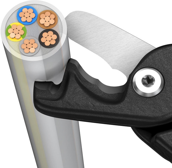 Coupe-câbles avec articulation de force, branches longues et tranchants optimisés : coupe jusqu'à 60% plus facile qu'avec des coupe-câbles compacts - capacité énorme : coupe des câbles unifilaires en cuivre ou en aluminium jusqu'à 35 mm², des câbles multifilaires jusqu'à 70 mm² et des câbles à fils fins jusqu'à 120 mm² - deux zones de coupe : la lame principale étagée maintient toujours les câbles de petite et de grande taille à proximité maximale de l'articulation lors de la coupe - la lame frontale sert à couper ("grignoter") progressivement les très gros câbles - utilisation confortable à une ou deux mains grâce à l'écartement réduit des branches - articulation de force vissée : démultiplication élevée, fonctionnement souple, réglable - tête mince pour une meilleure accessibilité - protection contre les pincements pour un travail en toute sécurité - ne convient pas pour les câbles renforcés d'acier comme les ACSR
