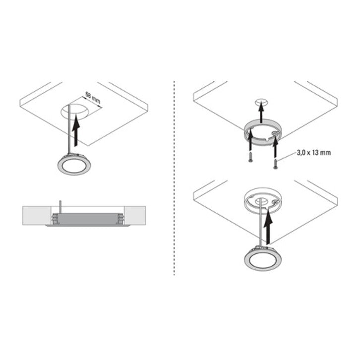 Spot LED encastré plat - source lumineuse diffuse sans points lumineux - durée de vie 30000 h - type de protection IP20 - angle de rayonnement 110° - Ø d'encastrement 58mm - ce luminaire contient des sources lumineuses LED intégrées - classe d'efficacité énergétique F