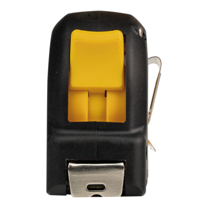 Ruban en acier peint en jaune - retour automatique du ruban et bouton de frein - graduation en mm - avec clip ceinture - oeillet pour attacher une dragonne - oeillet à clou intégré dans le crochet - boîtier en plastique ABS - classe de précision CE II