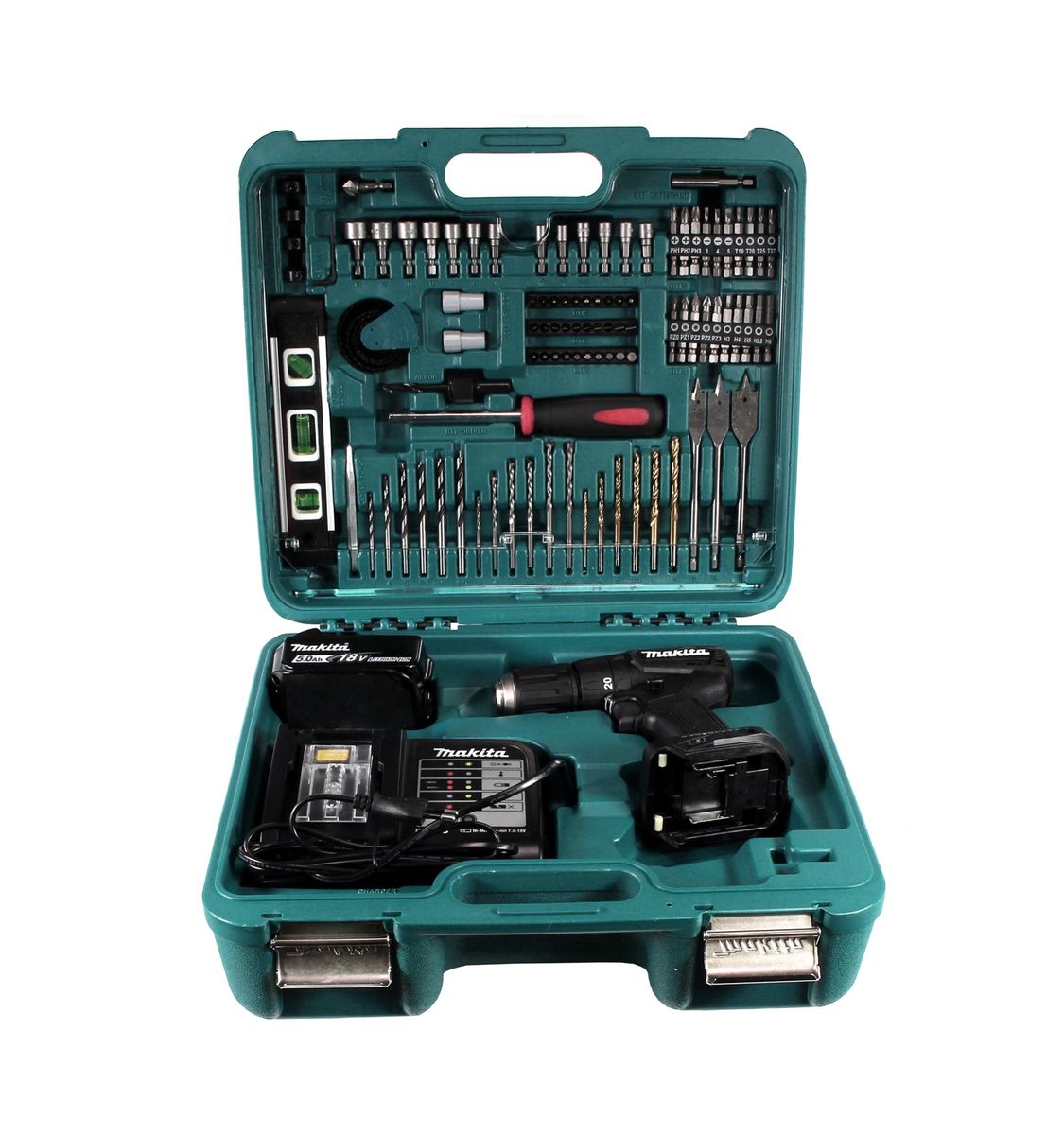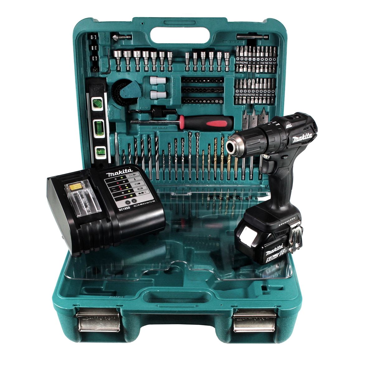 Makita DHP 483 SFTK B Perceuse visseuse à percussion sans fil 18V 40Nm + 1x Batterie 5,0 Ah + Chargeur + Coffret de transport contenant 101 pièces à outils