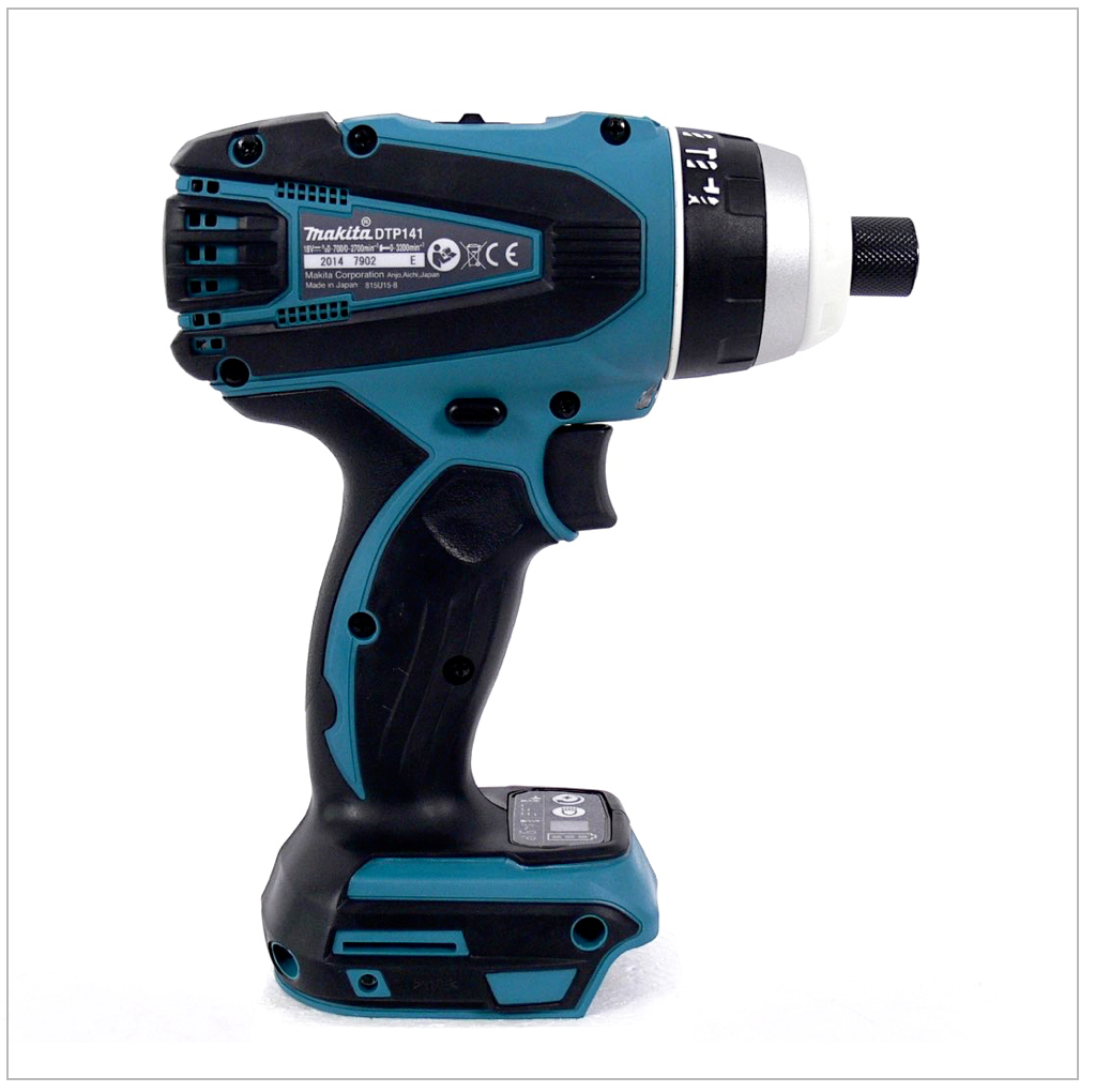 Le  DTP 141 du fabricant Makita a été spécialement conçu pour le vissage à percussion dans le bois, pour le perçage à percussion dans les matériaux tels que : la brique, le béton et la pierre ainsi que pour le perçage et le vissage sans mécanisme d'impact dans les matériaux suivants : bois, métal, céramique et plastique. La particularité de la visseuse quadro ( 4 fonctions ) sans fil est sa large gamme d'applications. Elle peut être utilisée pour le perçage et le vissage d'une part et pour le perçage et le vissage à percussion d'autre part. Son boîtier compact et son moteur sans balais garantissent une longue durée de vie. De plus, cet outil dispose d'un système de réglage du couple 16 fois supérieur en mode perçage et de réglage du couple 16 fois supérieur en mode perçage à percussion. Par ailleurs, pour le mode de vissage, vous pouvez choisir entre dix modes de réglages différents, et entre trois positions pour le mode de vissage à percussion. Sa force de frappe peut être réglée en trois positions : forte, moyenne et faible, ce qui  permet un serrage en fonction de l'application. Son niveau de force d'impact faible est utilisé pour le serrage des vis à ailettes et le serrage des petites vis ( Exemple M6). Son niveau de force d'impact moyen permet le serrage dans les panneaux préfabriqués et  les plaques de plâtre. Si la puissance et la rapidité sont requises, par exemple pour le serrage de matériaux d'infrastructure, de longues vis ou de boulons, sélectionnez le niveau fort. Son moteur à 4 pôles compacte, garantit l'absence de perte de couple et une faible consommation d'énergie.