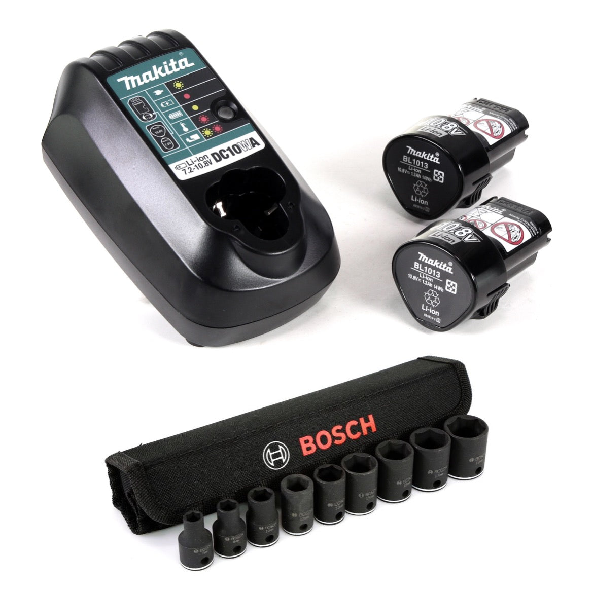 Makita TW 100 DWE Clé à chocs sans fil 10,8 V 3/8" + 2 x batterie BL 1013 1,3 Ah + chargeur DC 10 WA + jeu de 9 clés à douilles 3/8"
