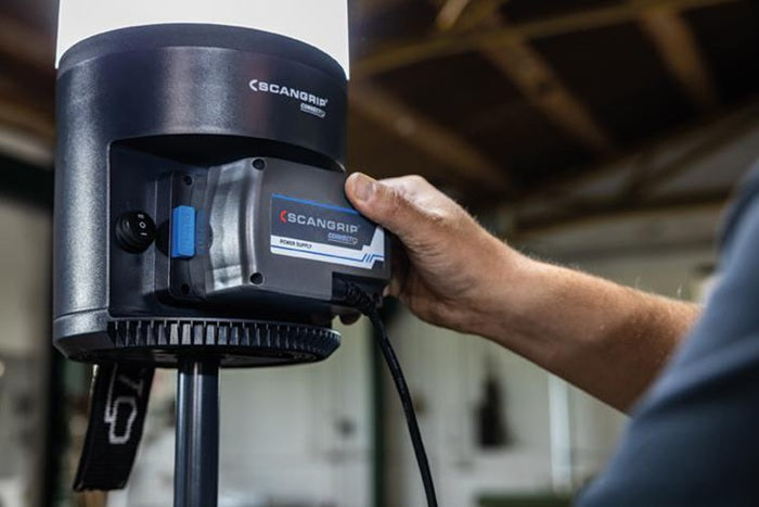 Lampe de travail 360° de 6000 lumens pour packs d'accus 18 V - lumière de travail diffuse et uniforme - deux niveaux d'éclairage (50-100 %) - crochet pour un placement flexible sur le SCANGRIP-TRIPOD - indice de protection IP65 - livrée sans accu/connecteur
